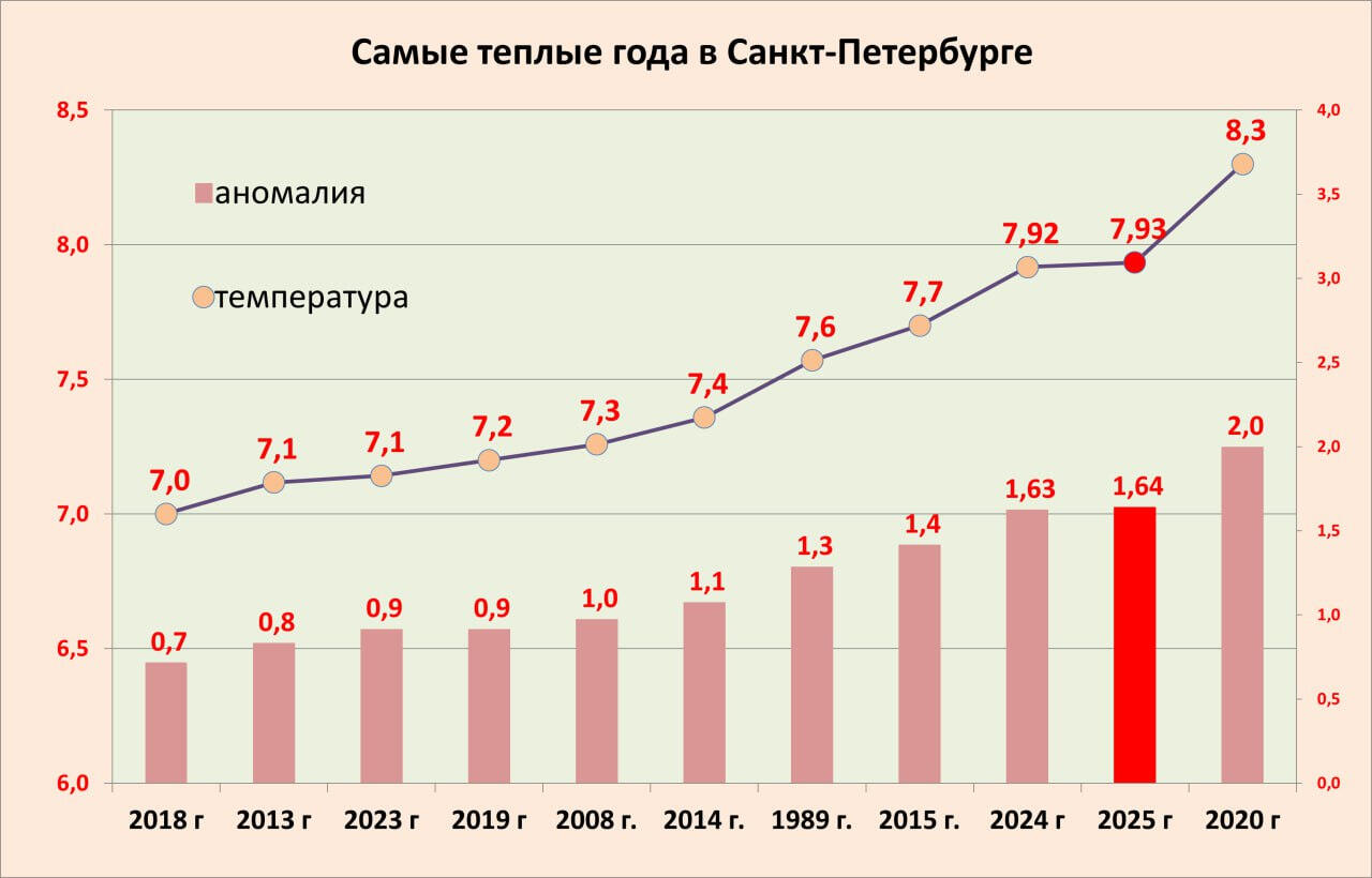 2025 год оказался в тройке самых теплых в истории Петербурга: средняя температура за год составила 7,93 градуса – на 0,01 градуса больше, чем в 2024-м. Минувший год не смог опередить только 2020-й: тогда средняя температура за год составила 8,3 градуса.