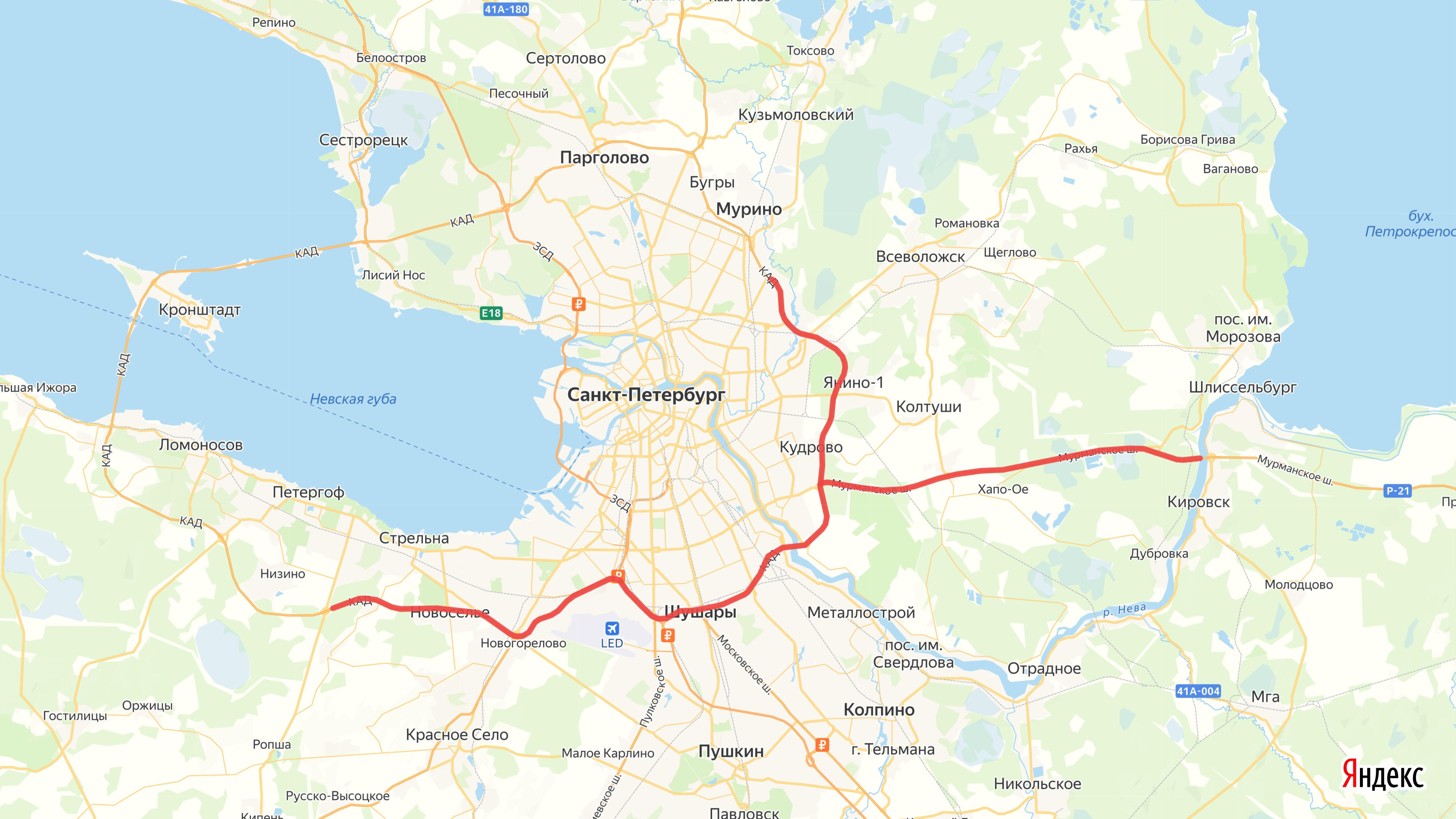 Перекрытия затронут участок КАДа с 94-го по 34-й километр, т.е. от развязки на пересечении с Ропшинским шоссе (автодорога Марьино – Ропша) до развязки на пересечении с Пискаревским проспектом, а также отрезок «Колы» с 12-го по 41-й километр – от Кольцевой автодороги до Кировска.