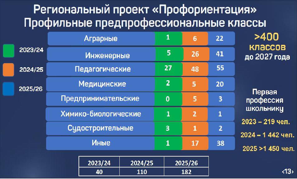 Надо просчитать все наши расходы, чтобы ежегодно мы открывали аграрные, инженерные, педагогические, медицинские, предпринимательские, химико-биологические, судостроительные, кадетские классы, потому что это очень важно, так мы закладываем будущее наших детей, которые должны оставаться в нашем регионе.