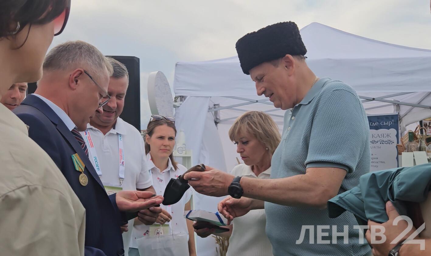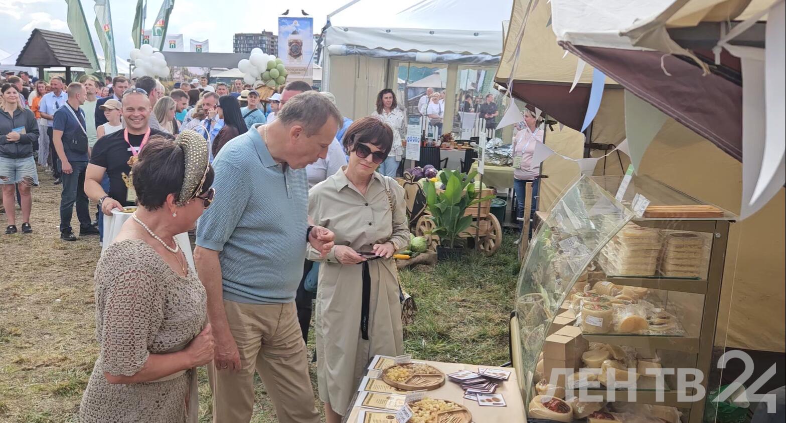 На стенде Гатчинского муниципального округа Александра Дрозденко встретила Людмила Нещадим. Они продегустировали сыры местного производства.