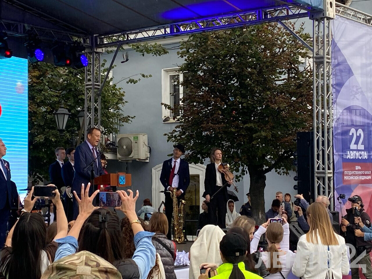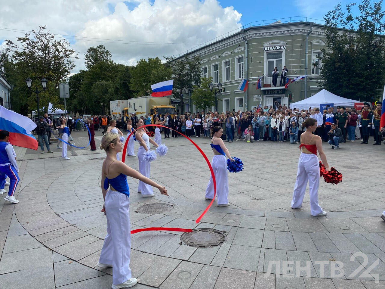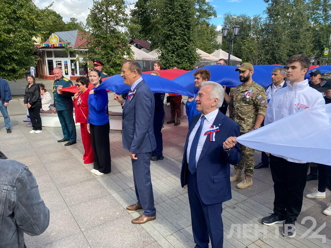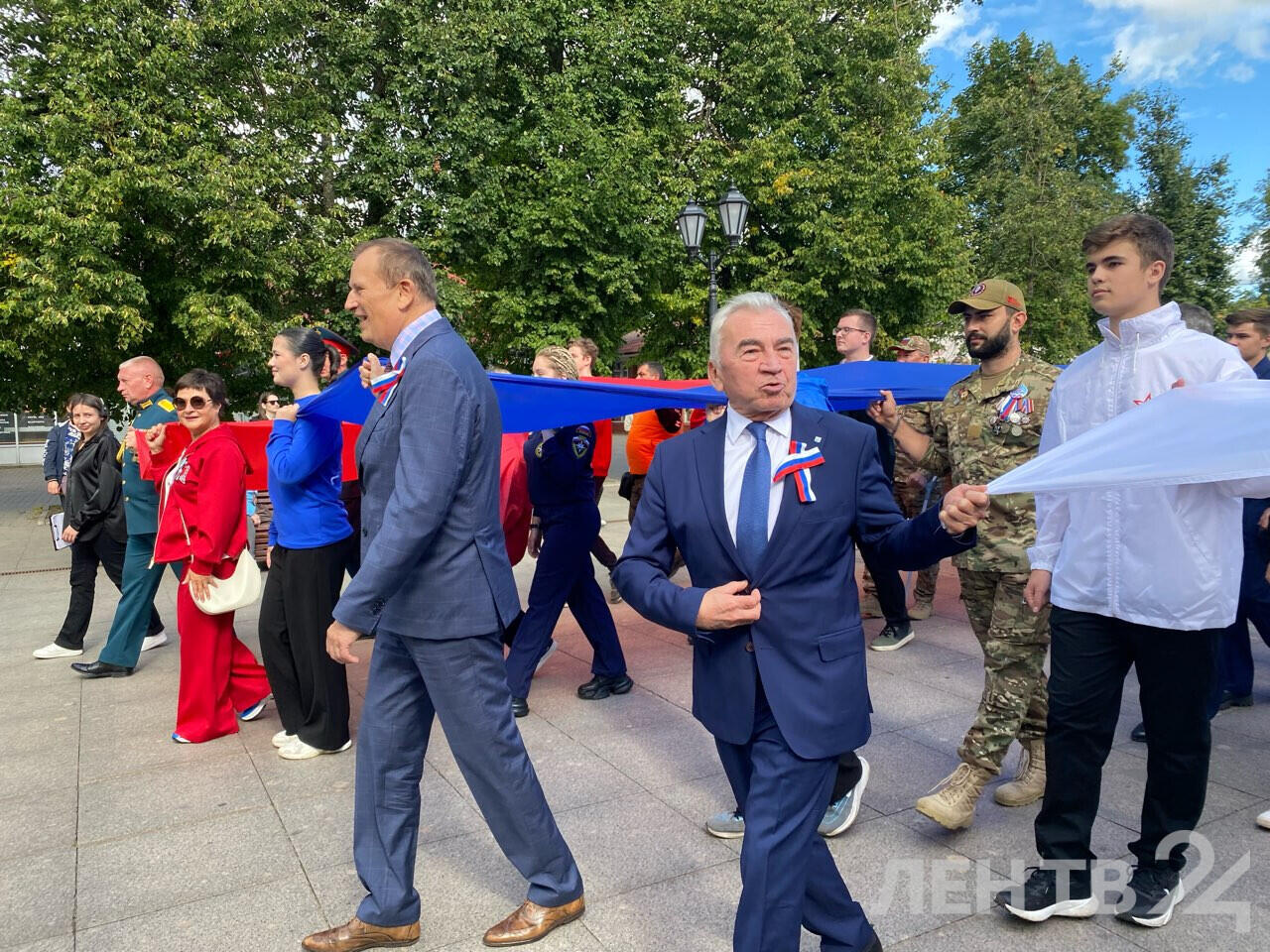 Вместе с волонтерами Движения Первых глава региона торжественно пронес гигантский флаг, а затем состоялось шествие делегаций муниципальных образований Ленобласти. Гостям праздника раздавали триколорные ленты.