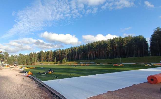 На строящемся стадионе в Подпорожье монтируют мачты освещения