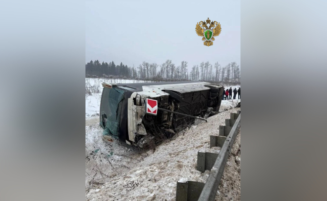 В Кингисеппском районе днем в понедельник, 19 января, произошло серьезное ДТП. На федеральной трассе А-180 «Нарва» автобус съехал в кювет и упал на бок.