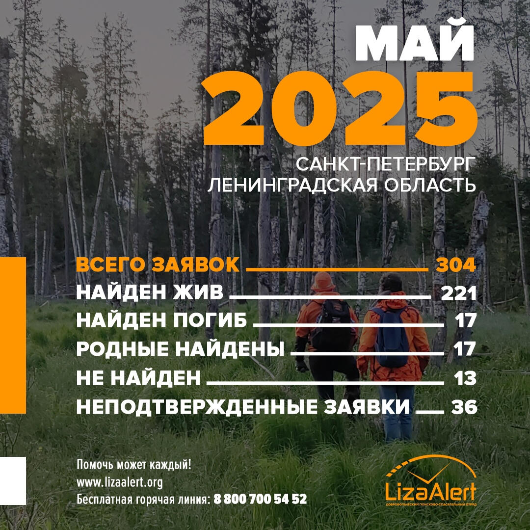 Петербургское отделение поисково-спасательного отряда «Лиза Алерт» подвело итоги минувшего месяца. В мае на горячую линию объединения поступило 304 заявки о пропавших в Петербурге или Ленинградской области.