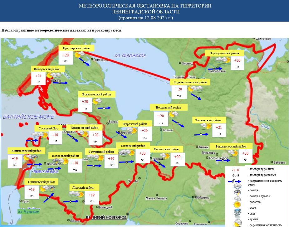 В ночь на вторник, 12 августа, в Ленинградской области ожидается переменная облачность, местами пройдут кратковременные дожди. Термометры покажут от +8 до +13 градусов, лишь кое-где будет теплее – до +16. Ветер западный, северо-западный, его скорость составит от 2 до 7 м/с.