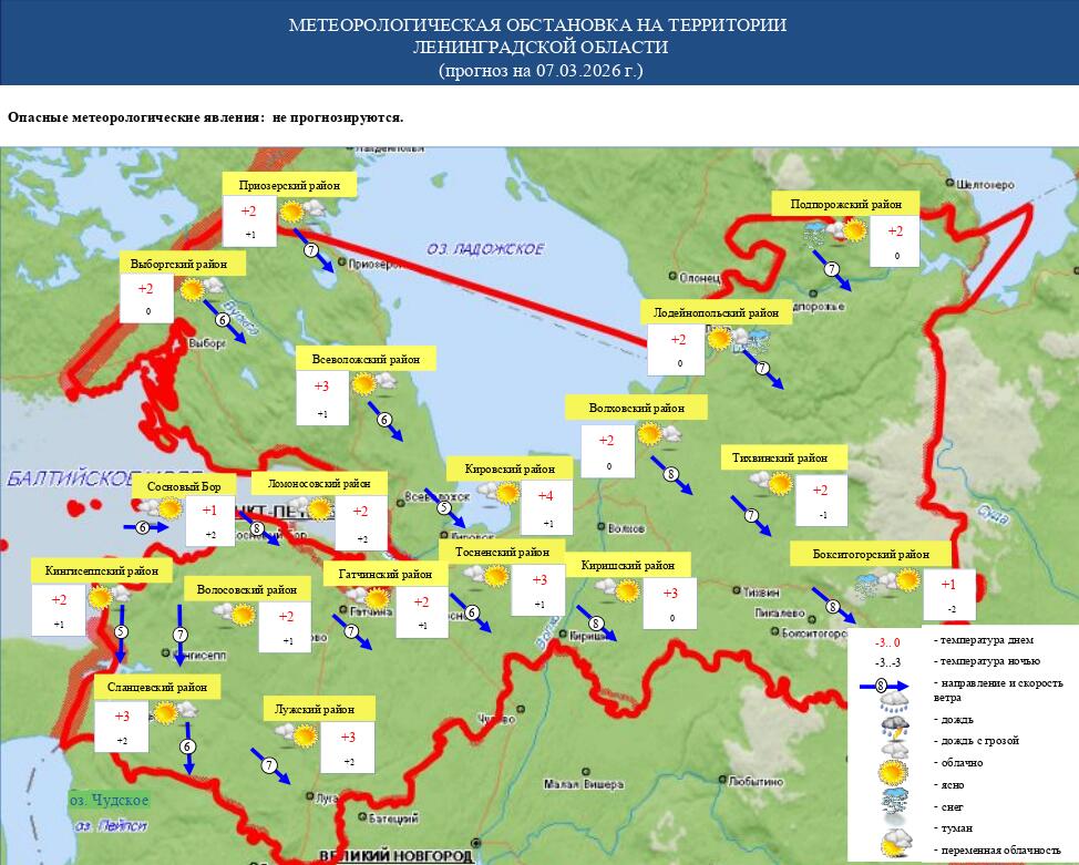 В Ленинградской области в ночь на субботу, 7 марта, будет облачно с прояснениями, а завтра днем ожидается переменная облачность. На большей части территории существенных осадков синоптики не прогнозируют, но ночью и в начале дня на востоке региона может пройти небольшой мокрый снег.