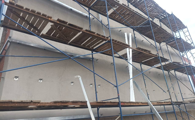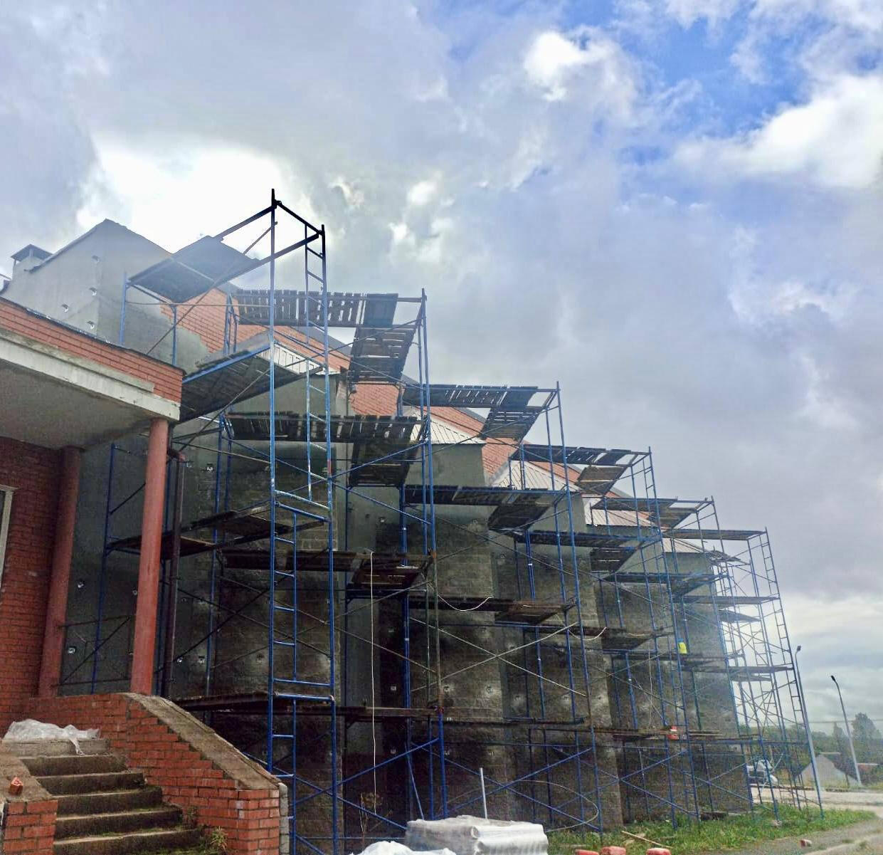 Сейчас мастера занимаются фасадами: выравнивают стены и монтируют фасадные панели, а внутри здания тем временем устанавливают новую систему вентиляции. На участке у ДК прокладывают траншеи для заземления.