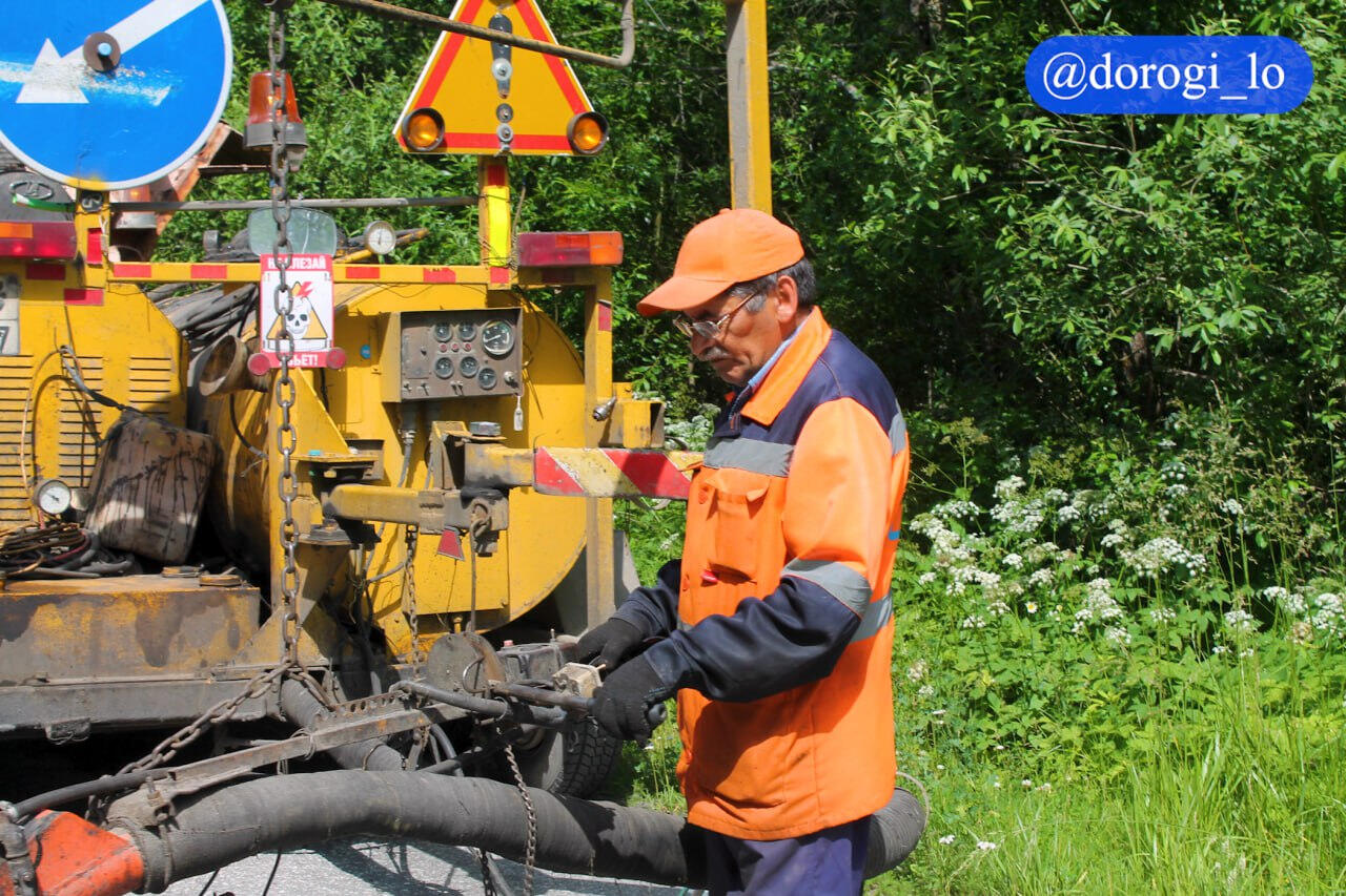 ремонт. Дорожники вели работы с помощью машины БЦМ. Как рассказали в Telegram-канале Dorogi_lo, оборудование заправляется
