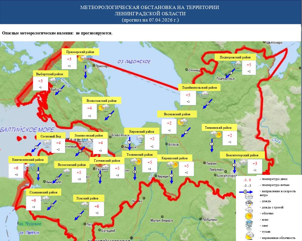 В этот вторник, 7 апреля, в Ленинградской области будет облачно с прояснениями. В большинстве районов синоптики прогнозируют кратковременный дождь, местами – с мокрым снегом и снежной крупы. Ночью кое-где на землю опустится слабый туман.