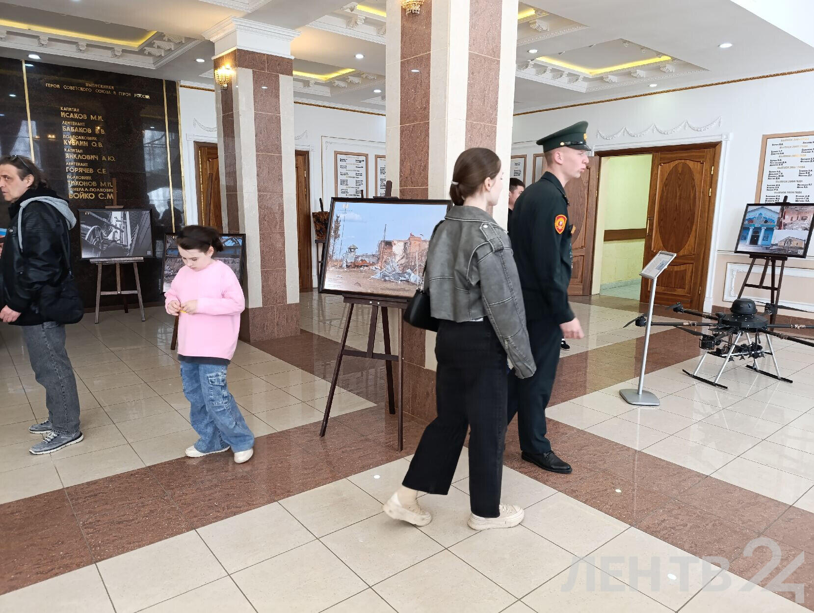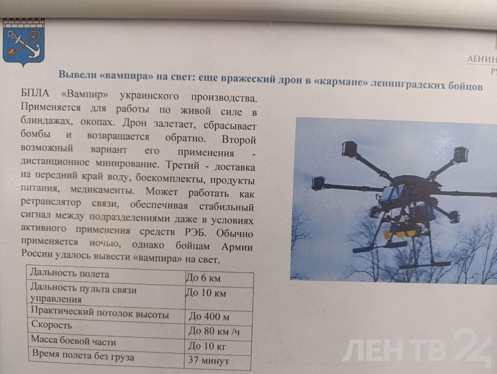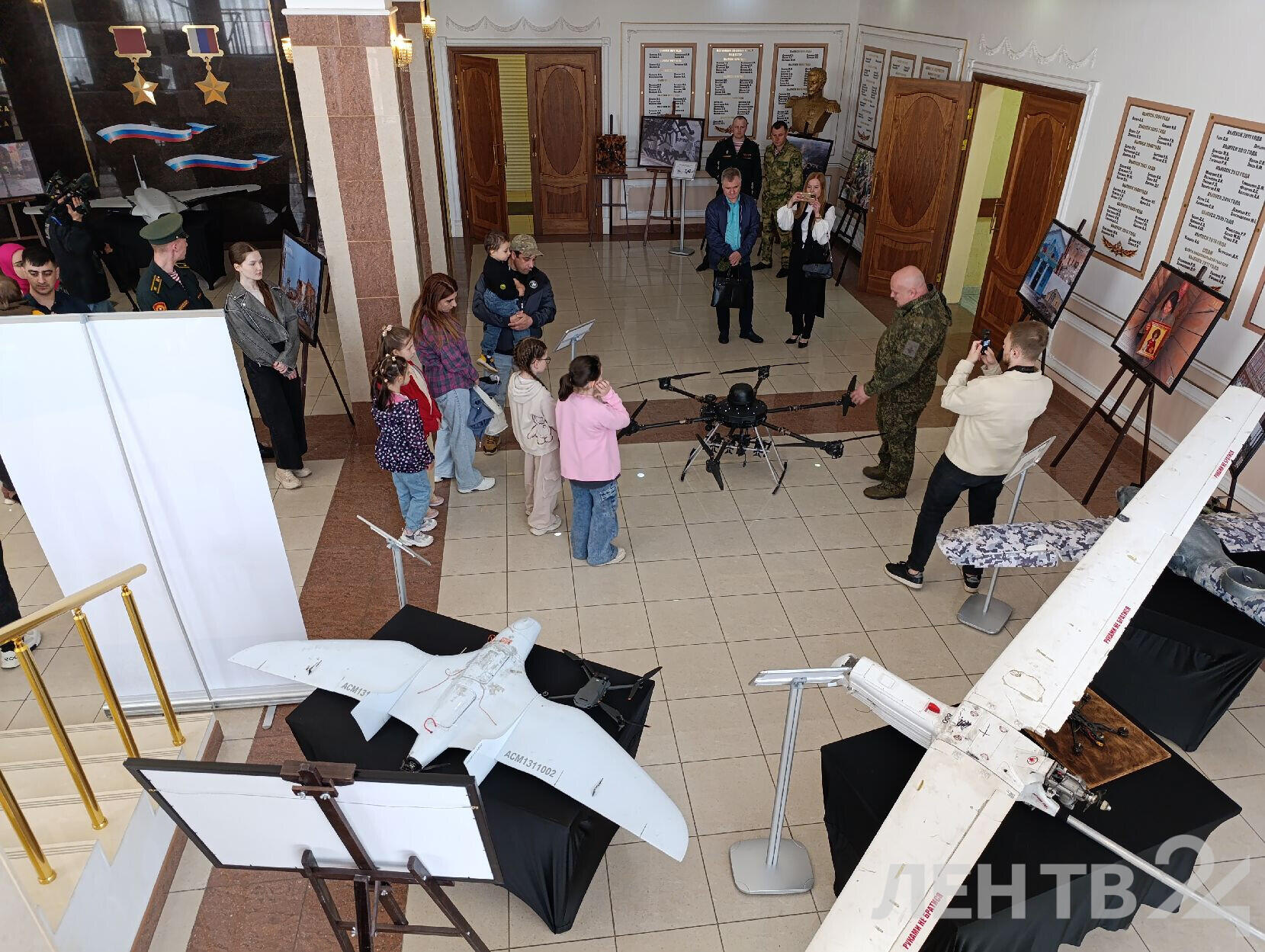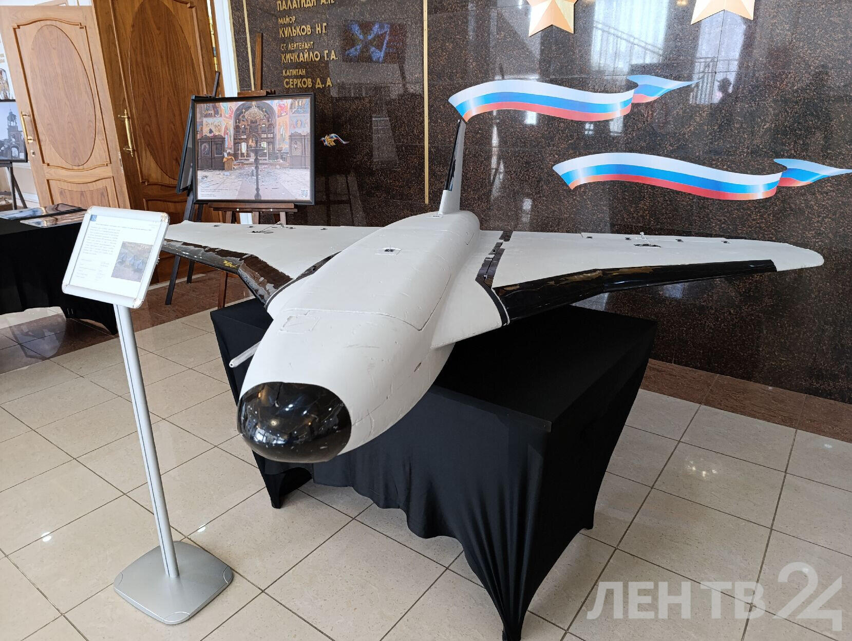 На экспозиции в Академии войск национальной гвардии России представлены 10 дронов: 9 трофейных и один российский, а также фотографии из зоны боевых действий.