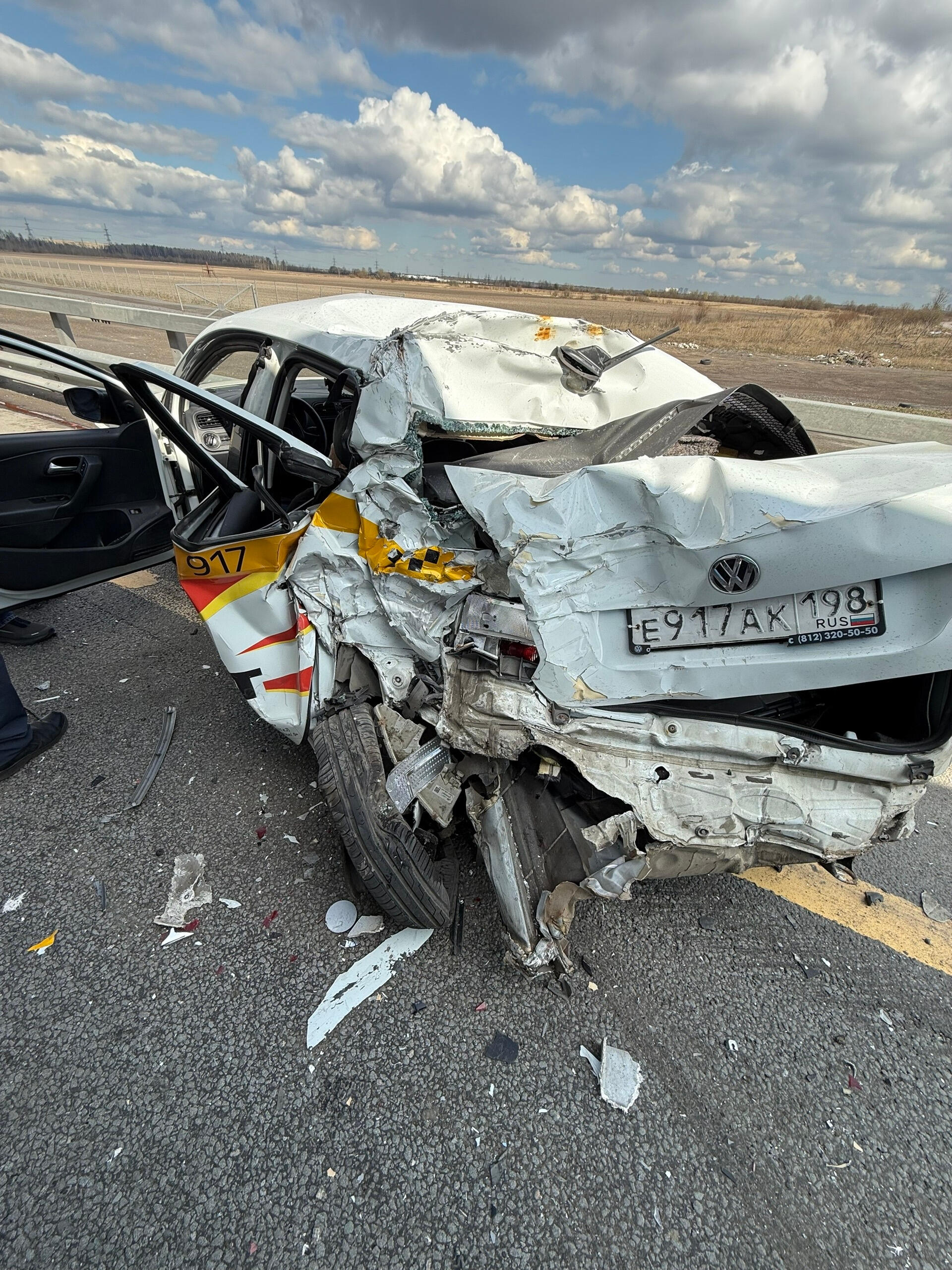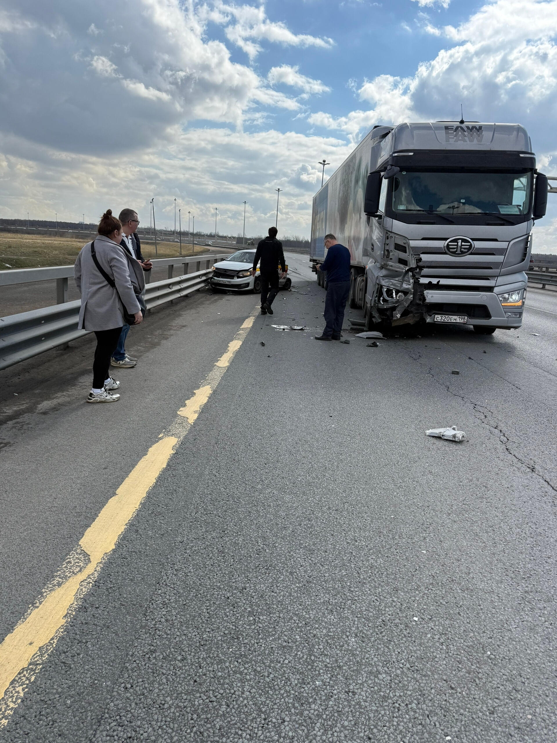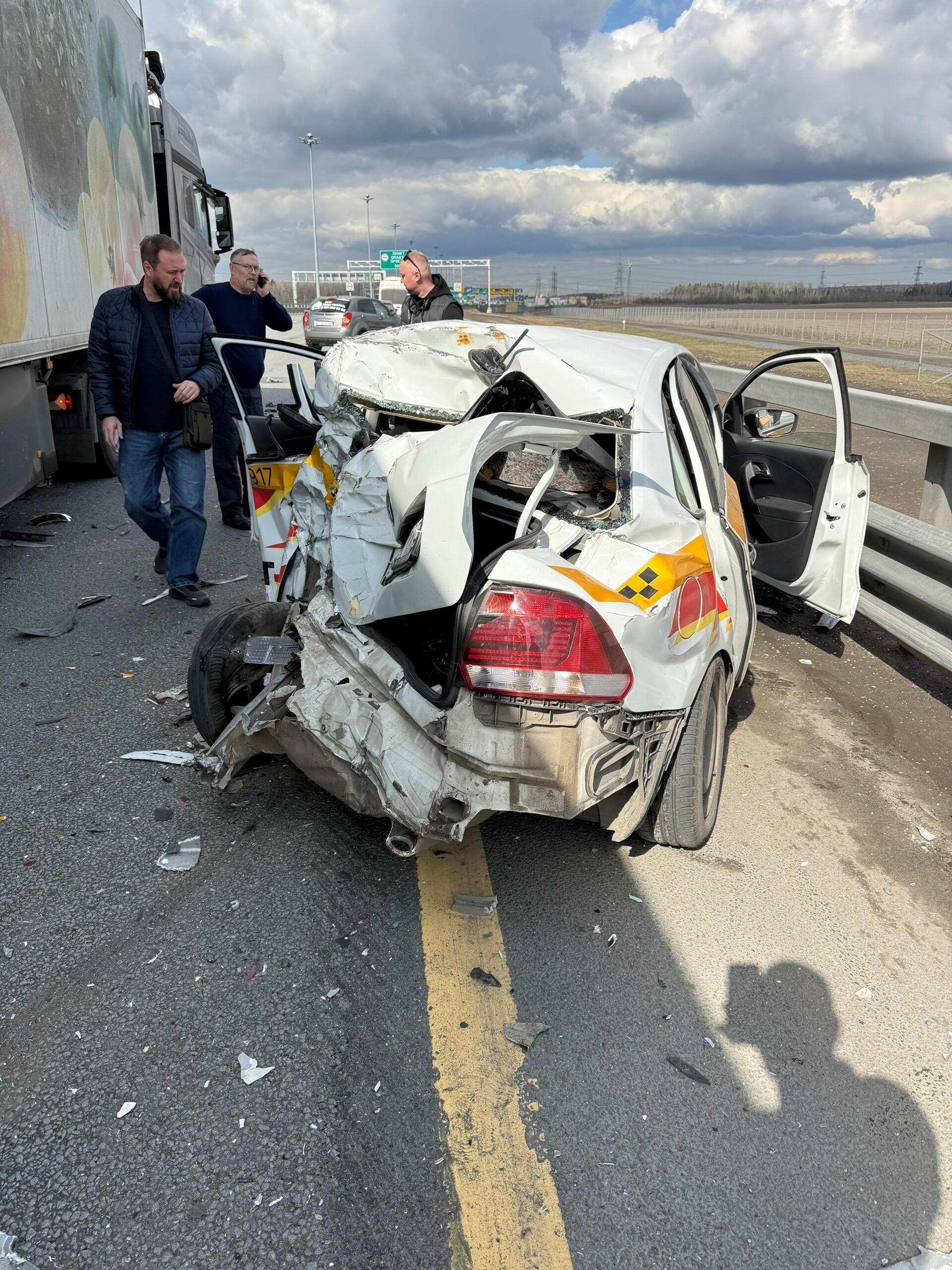 Серьезное ДТП произошло в понедельник, 13 апреля, на ЗСД. Перед съездом на КАД большегруз влетел стоявший на обочине автомобиль «Фольксваген Поло».