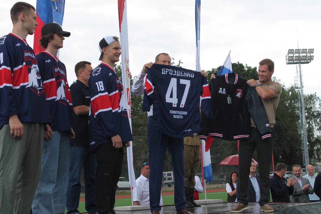 Президент Федерации хоккея Ленобласти Валерий Покровский на сцене поблагодарил главу 47 региона Александра Дрозденко за поддержку новой команды, а игроки подарили губернатору футболку клуба с символичным номером «47».