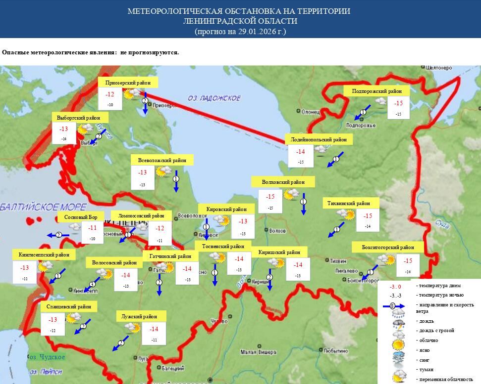 Морозы не спешат покидать Ленинградскую область. В ночь на четверг, 29 января, в регионе прогнозируют от -12 до -17 градусов, но при прояснениях будет и того холоднее – до -20…-24. Завтра днем столбики термометров покажут от -9 до -14 градусов.