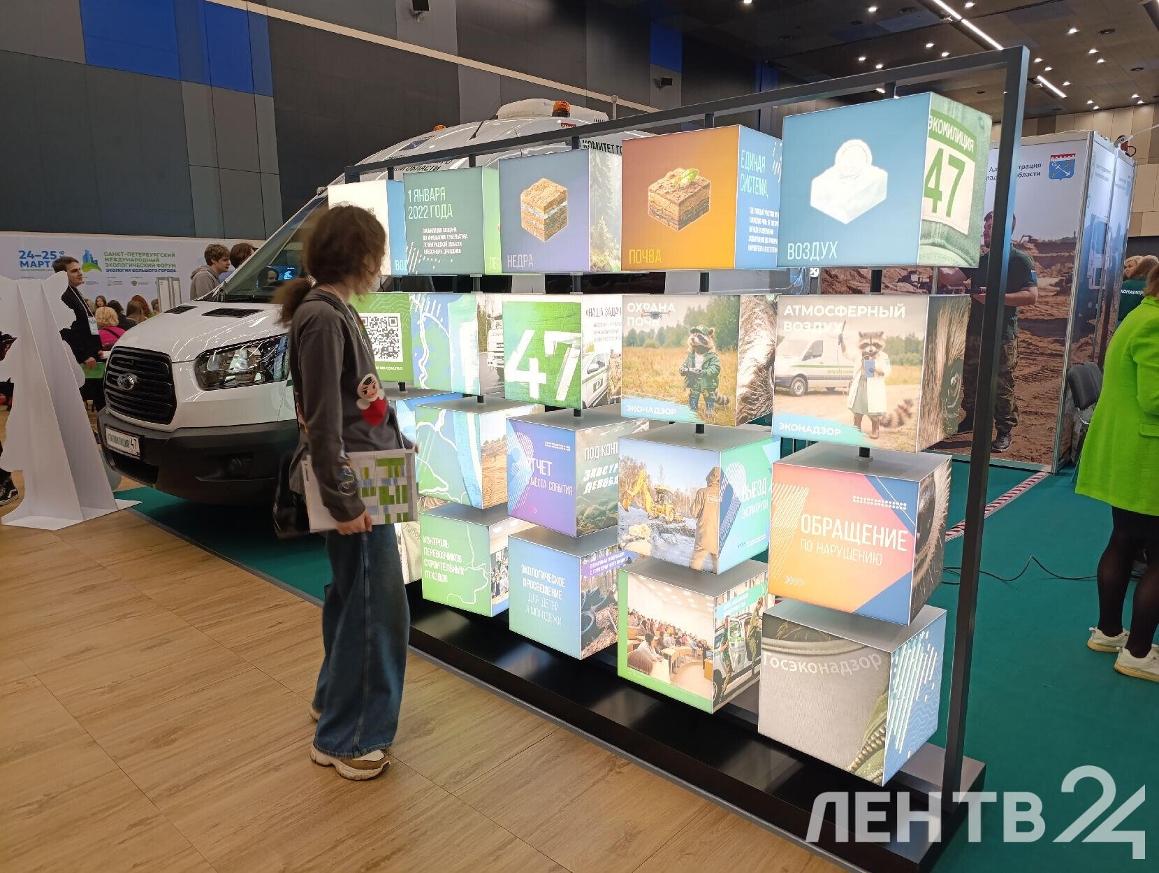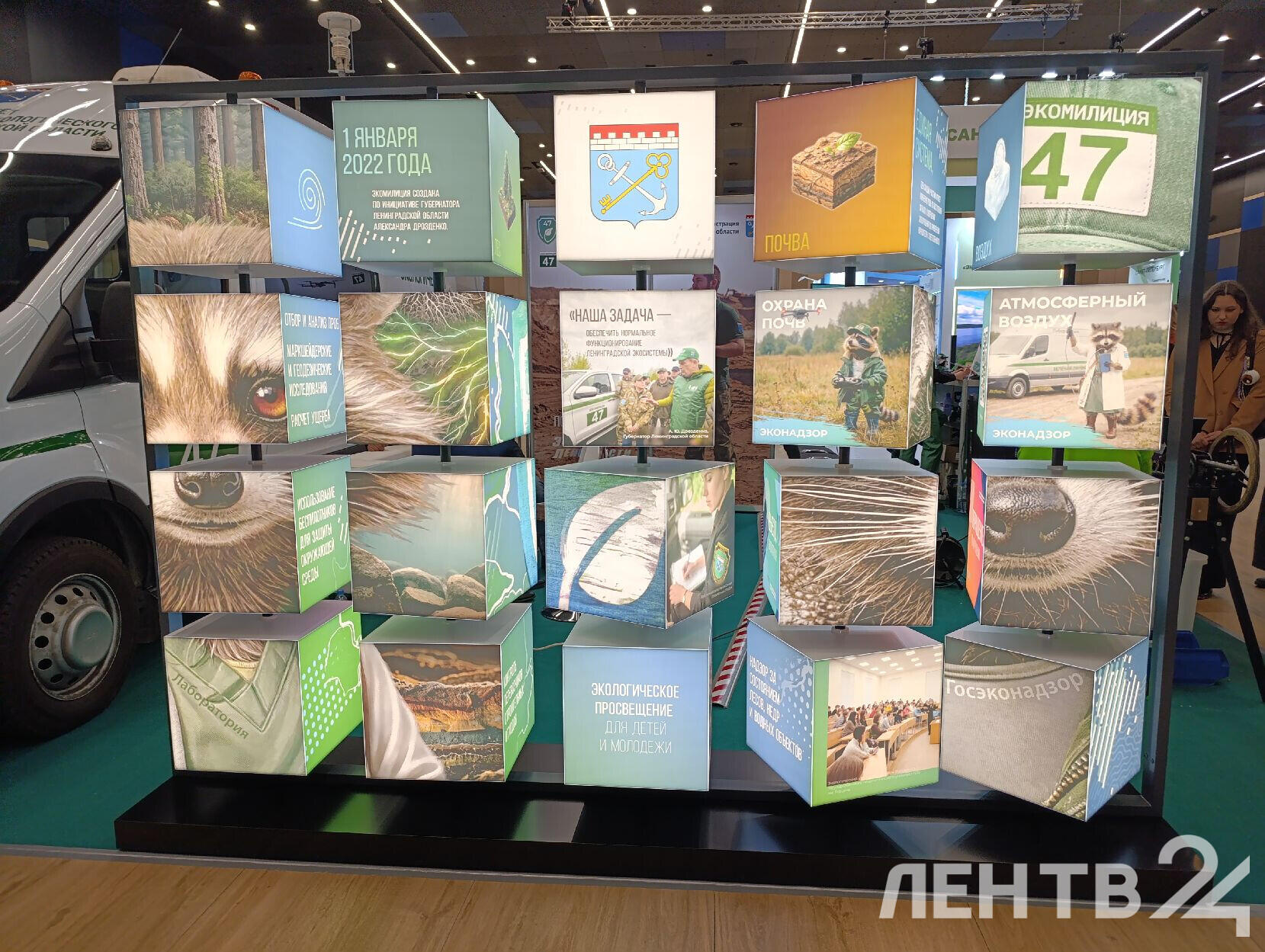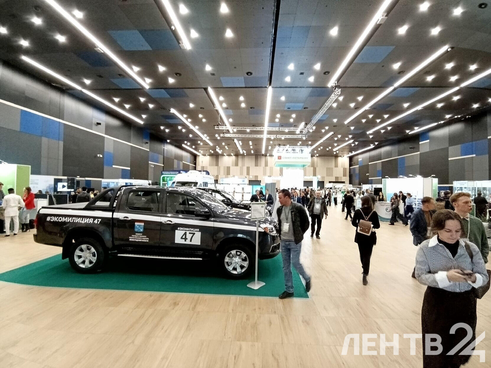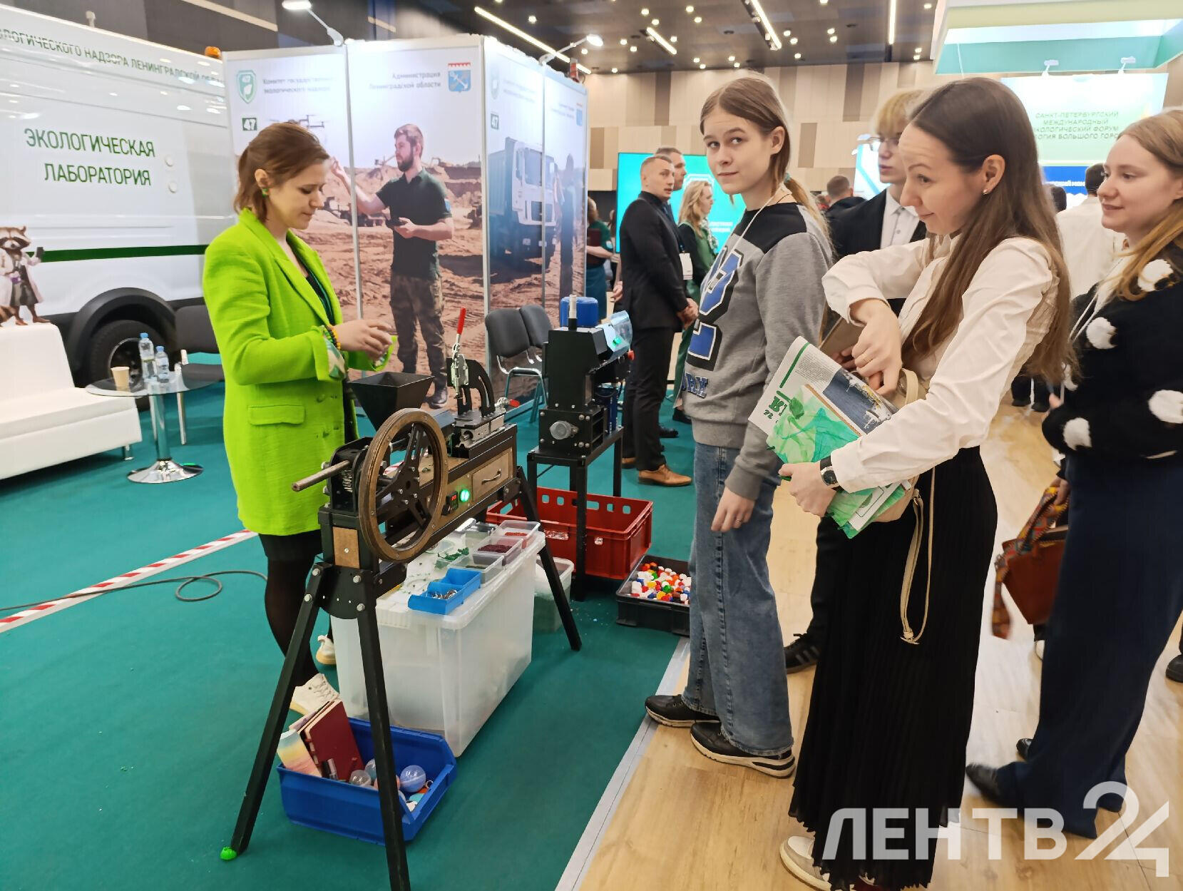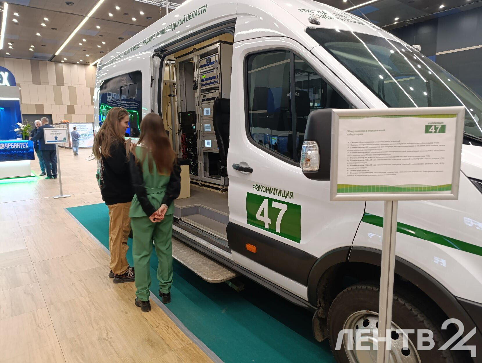 На стенде Экомилиции в «Экспофоруме» представлены специальные автомобили, устройства для переработки твердых отходов от проекта «Крышечки доброты» и микроавтобус с мобильной лабораторией.