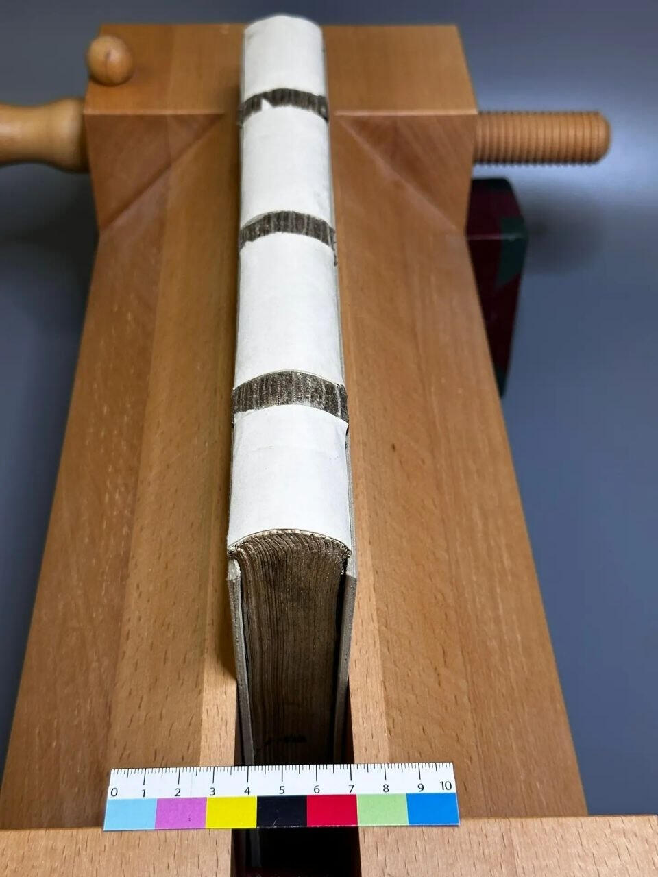 Свадебная книга была в удручающем состоянии, от времени она попросту истлела: переплет крошился, а шёлковый шнурок почти сгнил. Новый вместо него специалисты сплели вручную по старинной технологии – на деревянной вилке, а листки документа бережно соединили.
