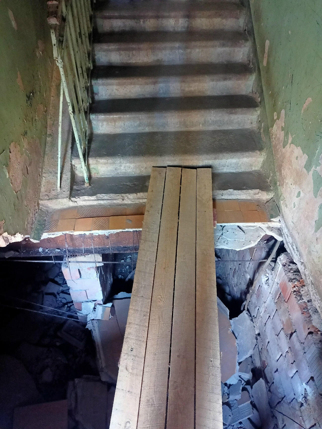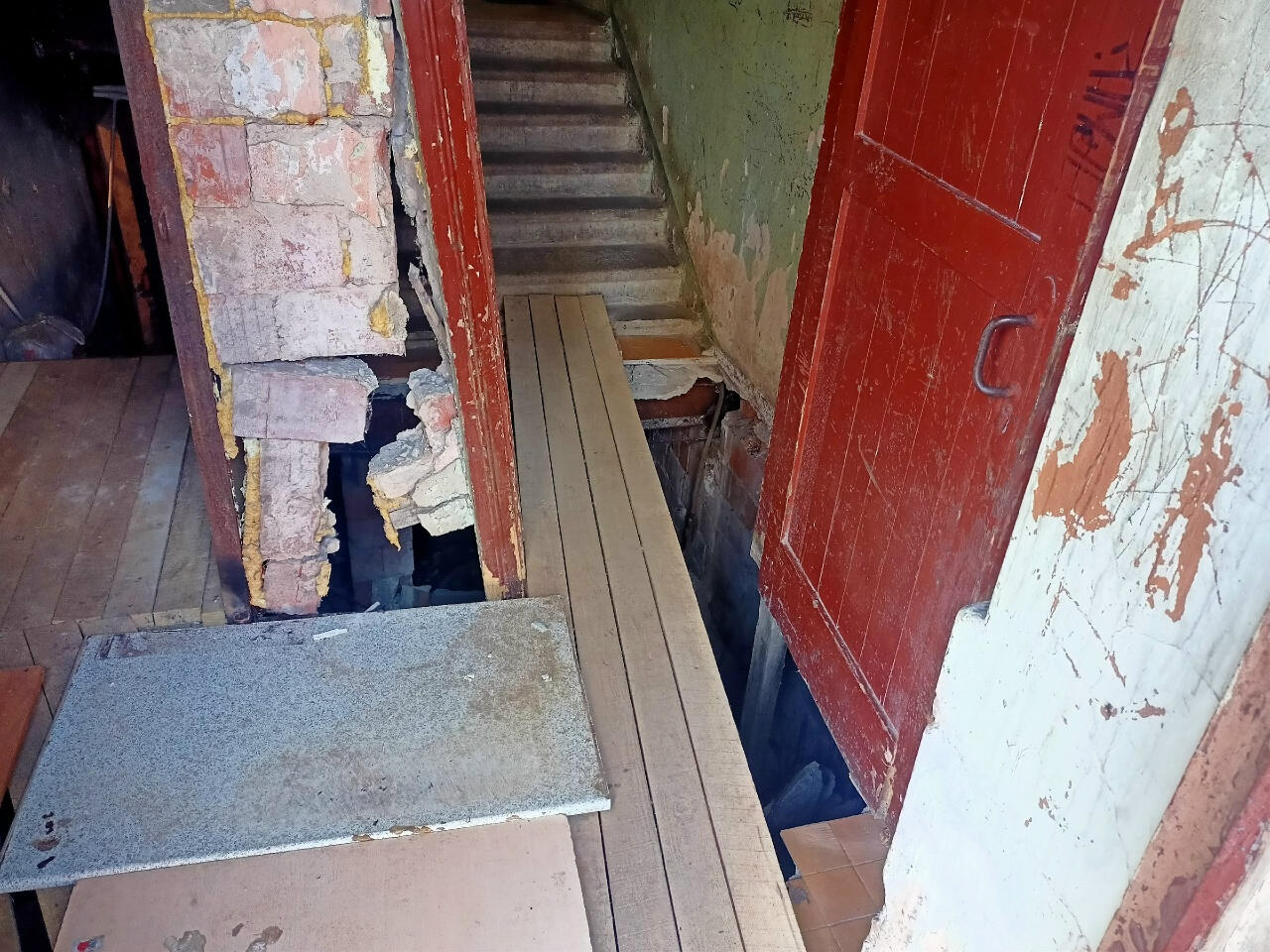 Как сообщает газета «Время», всё случилось еще 11 апреля. Жильцы считают, что разрушения начались после пожара 2021 года, когда в подвальном помещении горели кабели. Тогда ремонт подъезда не провели. Кроме того, отопительная система регулярно «парит» в подвале.