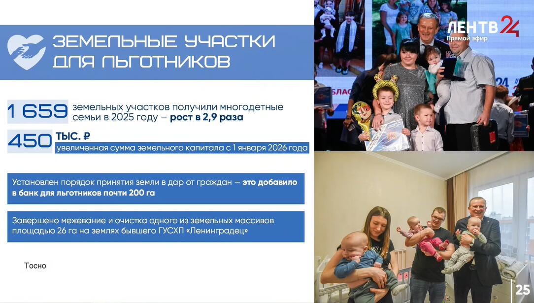 В Тосно 15 апреля губернатор Ленинградской области Александр Дрозденко представил отчет о работе регионального правительства за 2025 год. В ходе выступления он рассказал о выполнении одного из шагов программы «10 шагов к мечте», связанного с обеспечением льготников земельными участками.