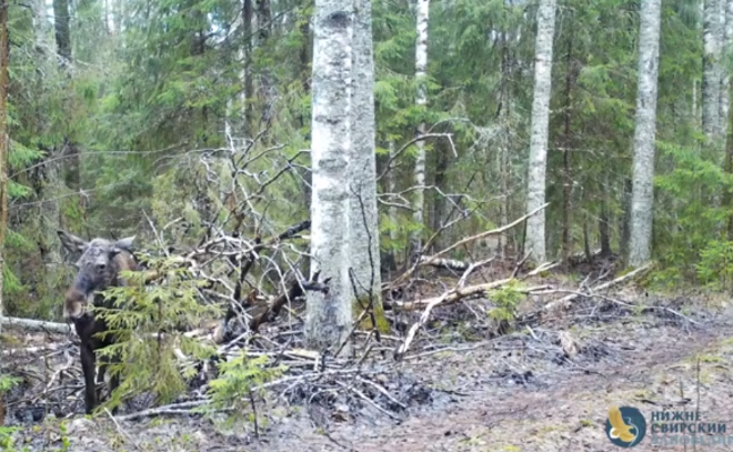 Камера наблюдения, установленная на территории Нижне-Свирского заповедника, запечатлела неторопливую трапезу настоящего лесного великана — лося.
