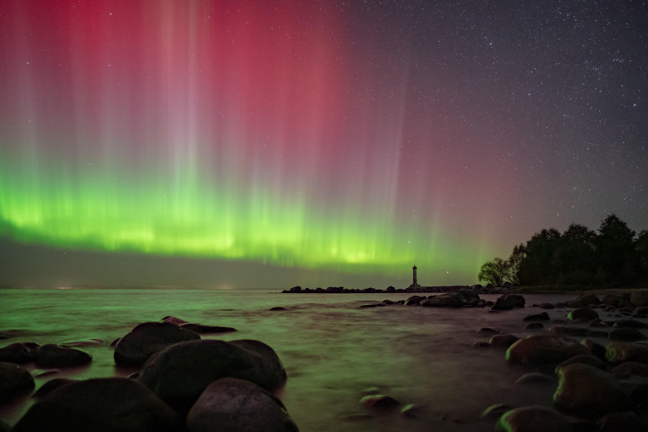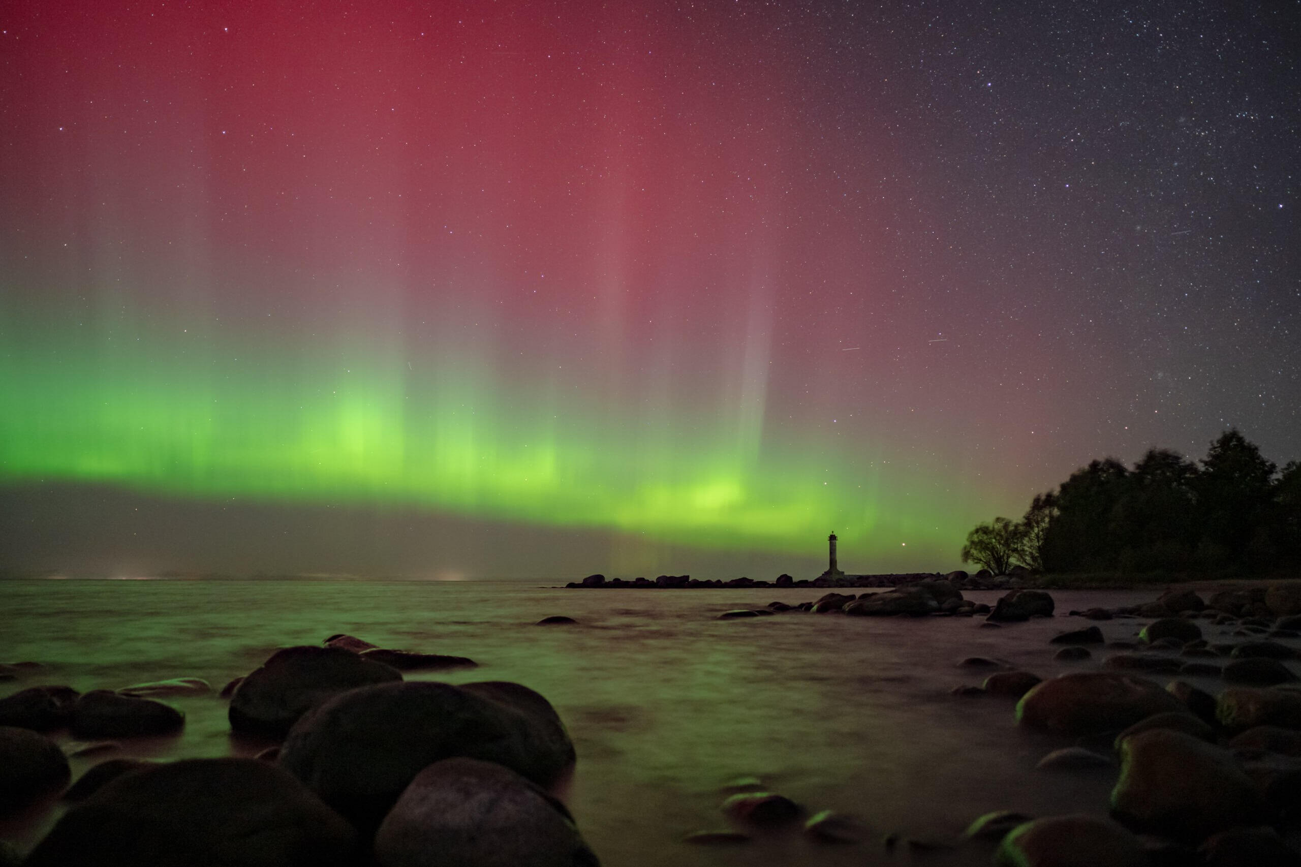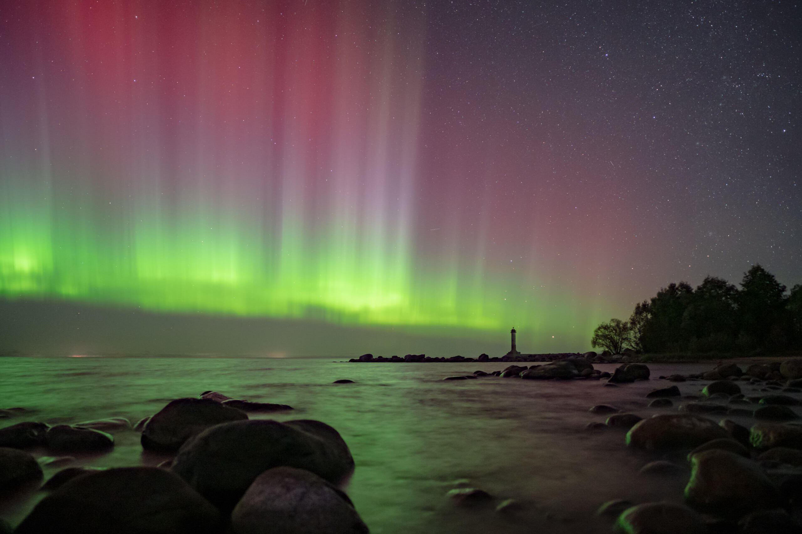 Красно-зеленые огни Авроры окрасили небо над Ладогой