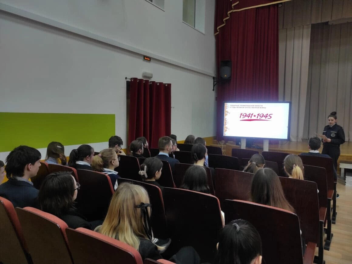 В преддверии 80-й годовщины Победы в Великой Отечественной войне в школах Ленинградской области проходят «Уроки Мужества». На них специалисты ГКУ «Леноблпожспас» рассказывают детям и подросткам о подвигах пожарных в годы войны.