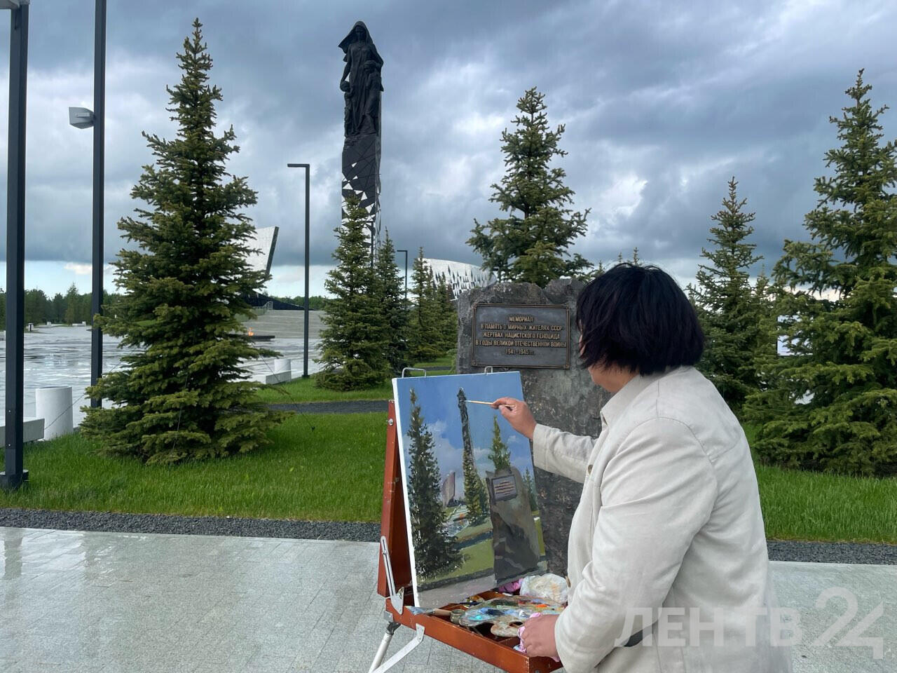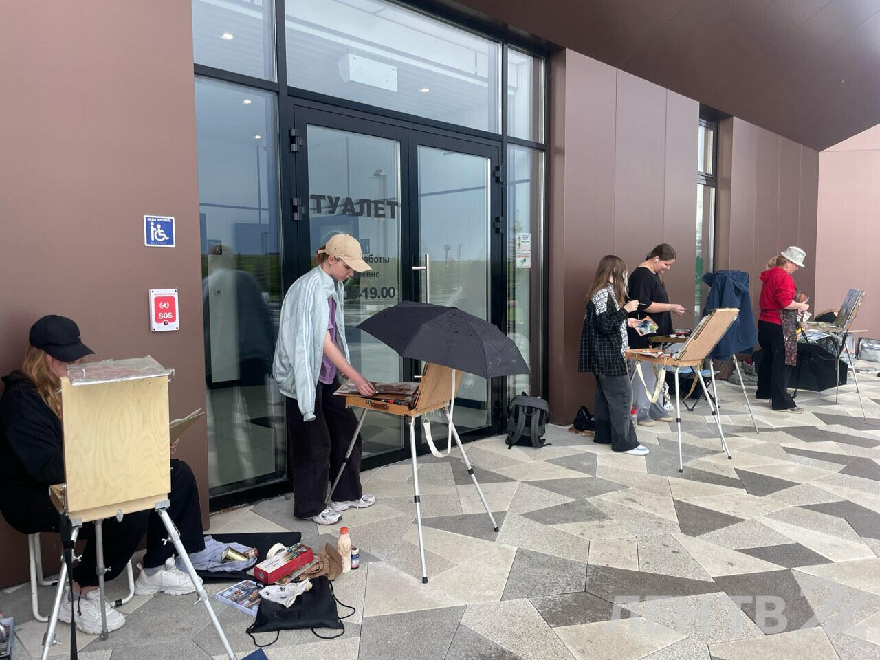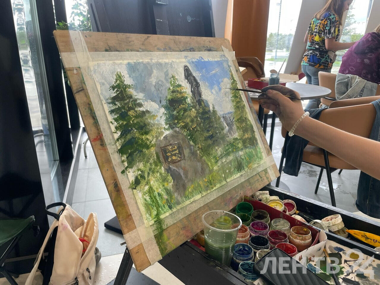 Несмотря на дождливую погоду, творческий процесс не прервался. Участники перебрались в кафетерий возле мемориала и продолжили работу. Всего картины написали 45 художников.