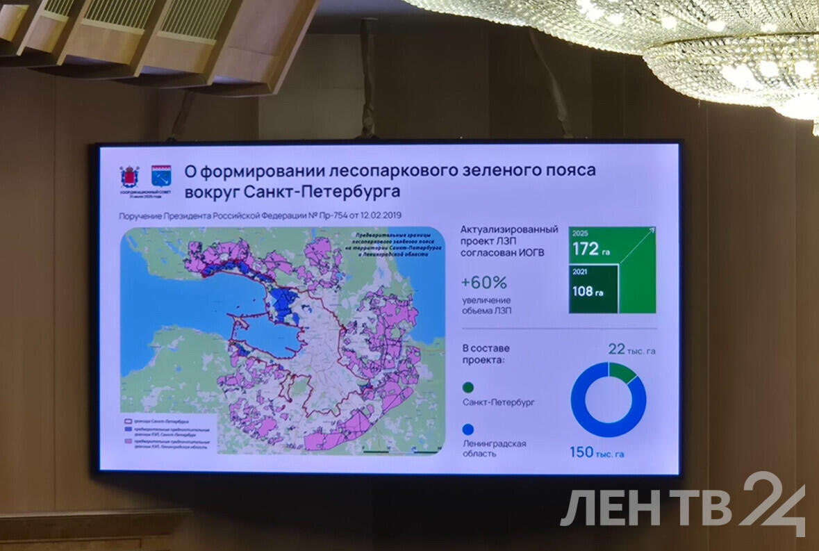Ключевой темой встречи стало сохранение природной среды. До конца 2026 года планируется создание лесопаркового зелёного пояса вокруг Санкт-Петербурга. Общая площадь составит более 170 тысяч гектаров, из них 150 тысяч — в Ленинградской области, 22 тысячи — в границах Петербурга.