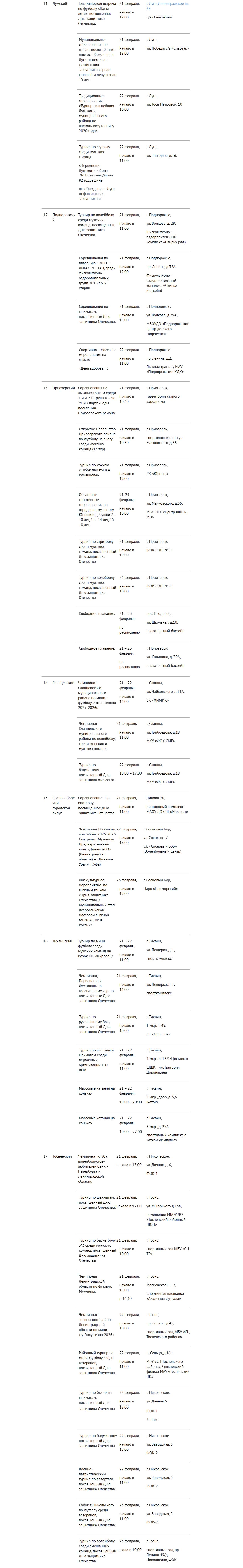 мероприятий. Об этом рассказали в пресс-службе 47-го региона. Так, в Киришском районе состоится лыжный марафон, посвященный