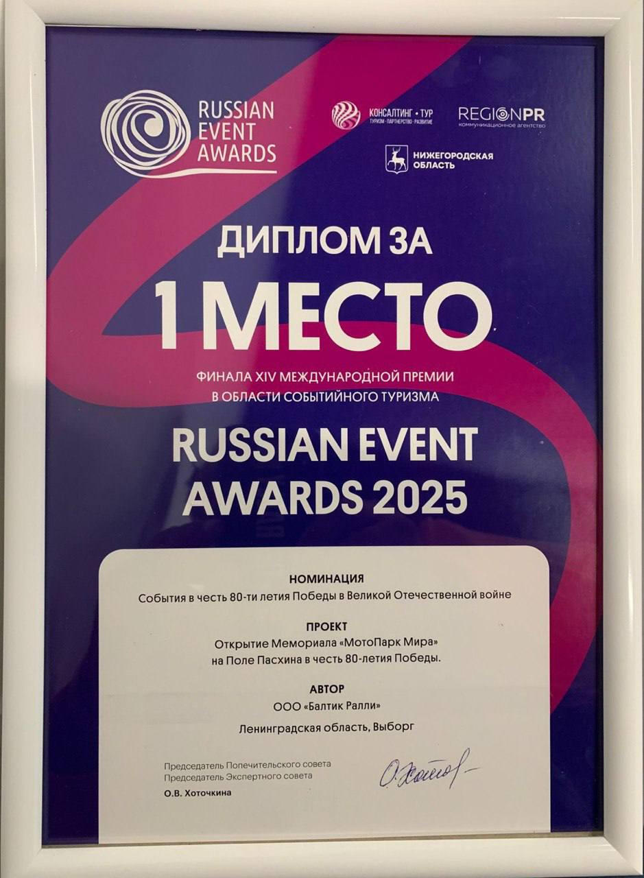 Первое место в номинации «События в честь 80-летия Победы в Великой Отечественной войне» занял мемориал «МотоПарк Мира», открытый в Поле Пасхина в июле нынешнего года во время юбилейного мотофестиваля «Балтик Ралли».
