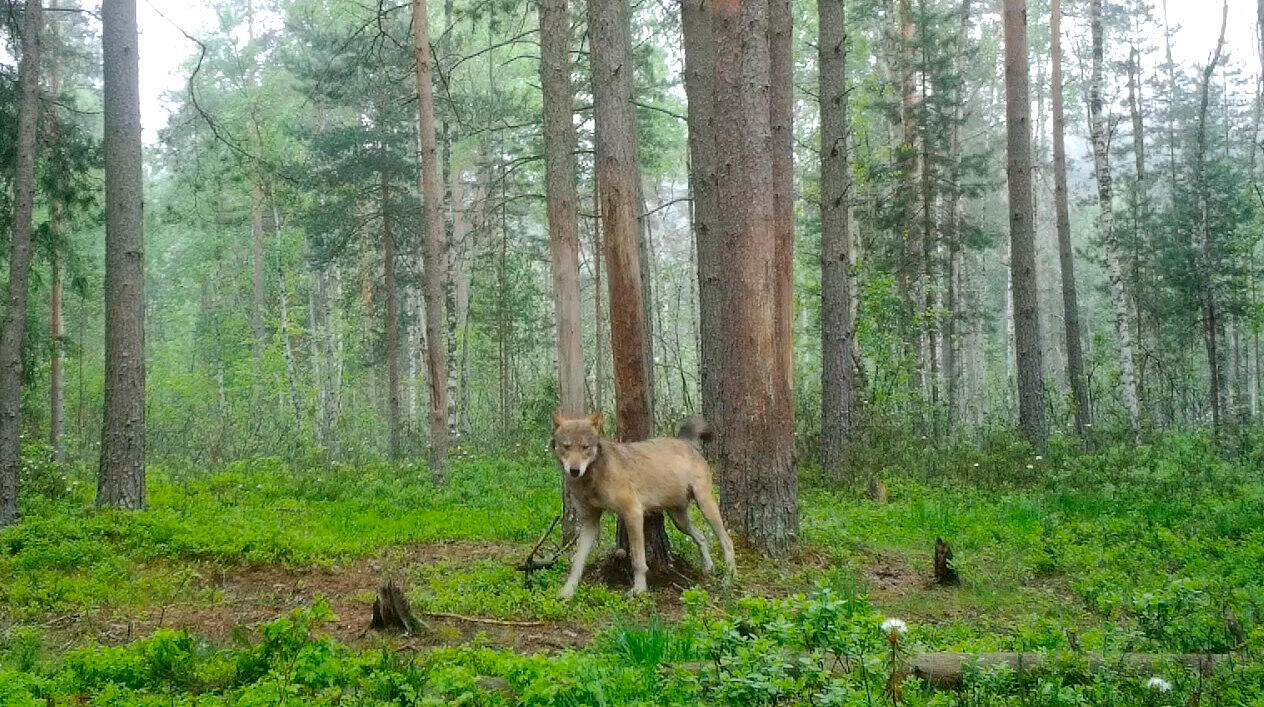 лесу во Всеволожском районе Ленобласти в объектив камеры попал волк, метящий
