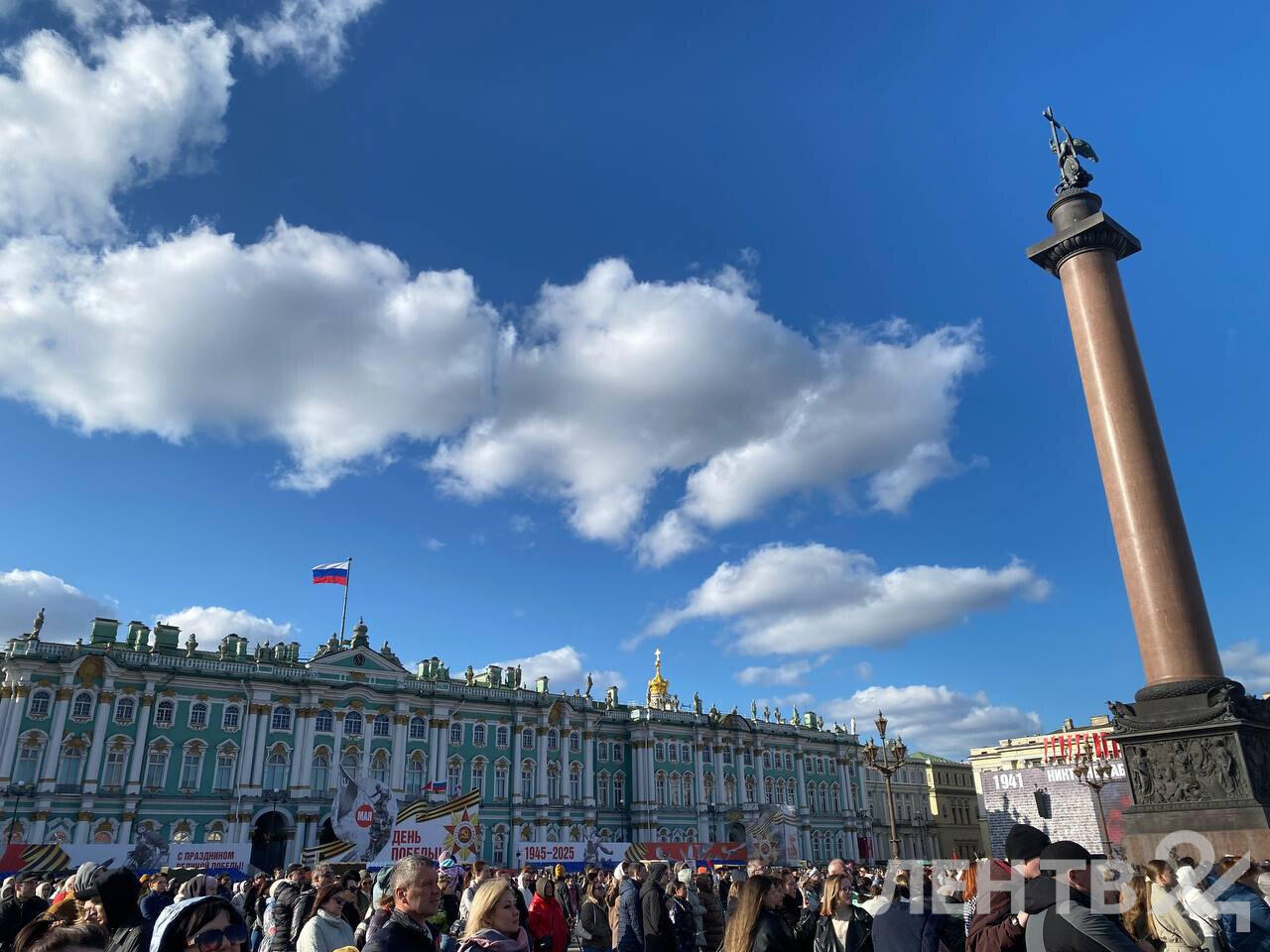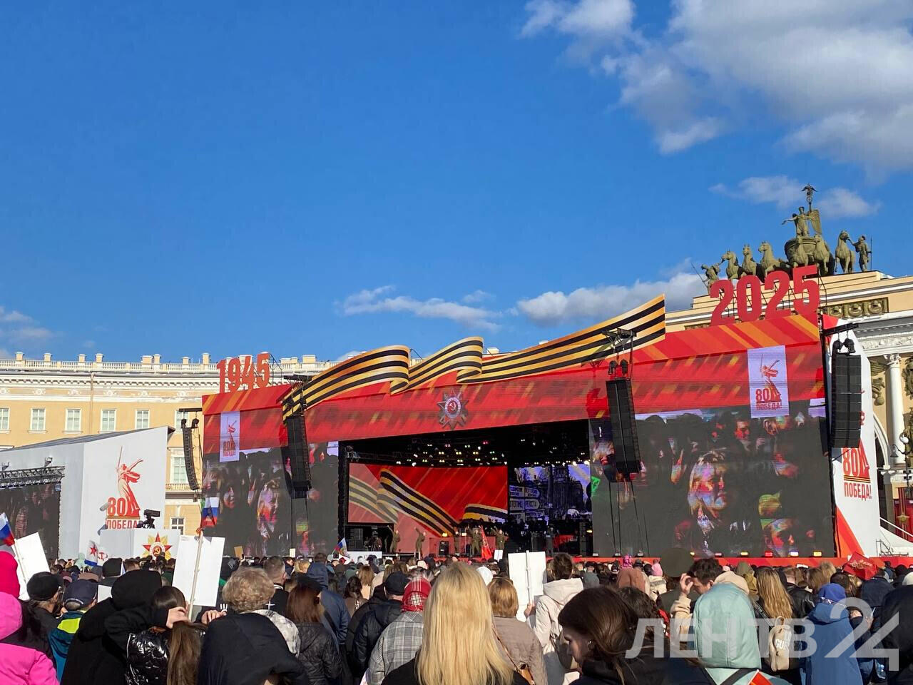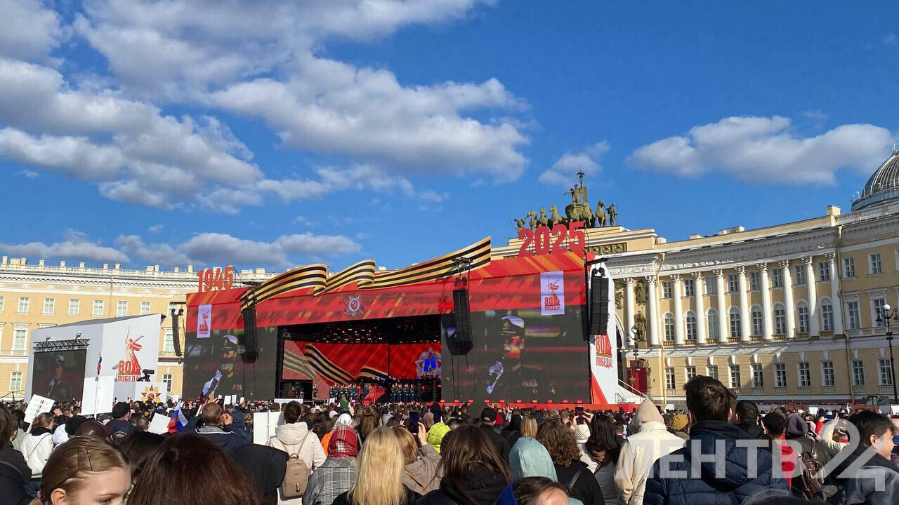 В Санкт-Петербурге на Дворцовой площади проходит праздничный концерт «От Победы к Победам», посвящённый 80-летию Победы в Великой Отечественной войне. Программу открыл народный артист России Александр Розенбаум.