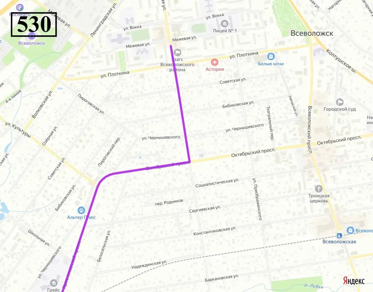 У автобуса №531 на время ограничений конечной станет станция «Всеволожская». Транспорт будет следовать по Всеволожскому и Октябрьскому проспектам с выездом на Колтушское шоссе, далее — по обычному маршруту.