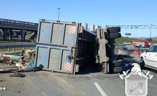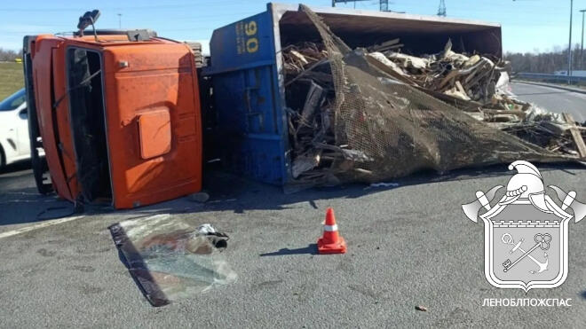 На съезде с КАД во Всеволожском районе опрокинулся грузовик