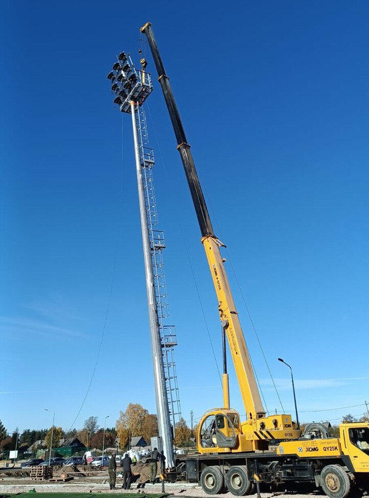 В Подпорожье продолжается строительство нового стадиона. Сейчас рабочие устанавливают 25-метровые мачты освещения, рассказали в стройблоке администрации Ленобласти.