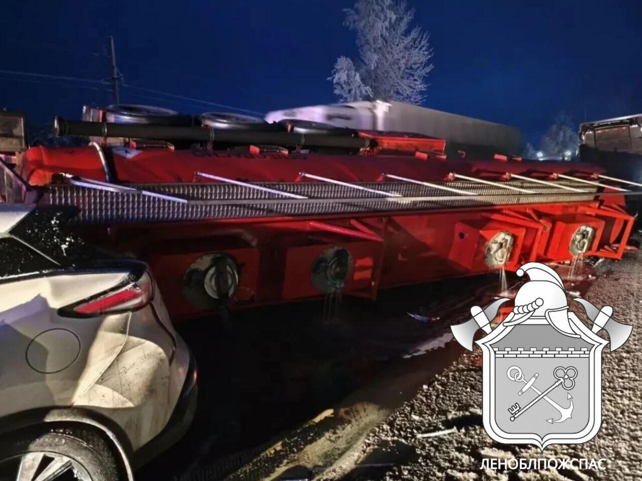 Отмечается, что от удара прицеп грузовика оторвался от кабины и опрокинулся на бок, топливо из поврежденной цистерны течет в придорожную канаву. Ликвидацией последствий ДТП занимаются личный состав 148 пожарной части Волховского отряда Леноблплжспас и ПСО города Новая Ладога.