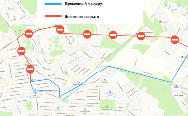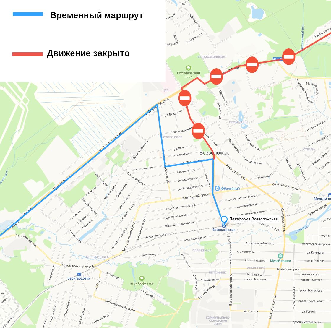Автобусы будут следовать по Всеволожскому проспекту и улице Плоткина с выходом на обычную трассу от остановки «Заводская улица». Из Санкт-Петербурга рейсы до 18:35 сохранят привычный маршрут до остановки «Всеволожск — Котово поле», после чего движение будет организовано только до «Платформы Всеволожская» без дальнейшего следования в сторону Рахьи и Углово.