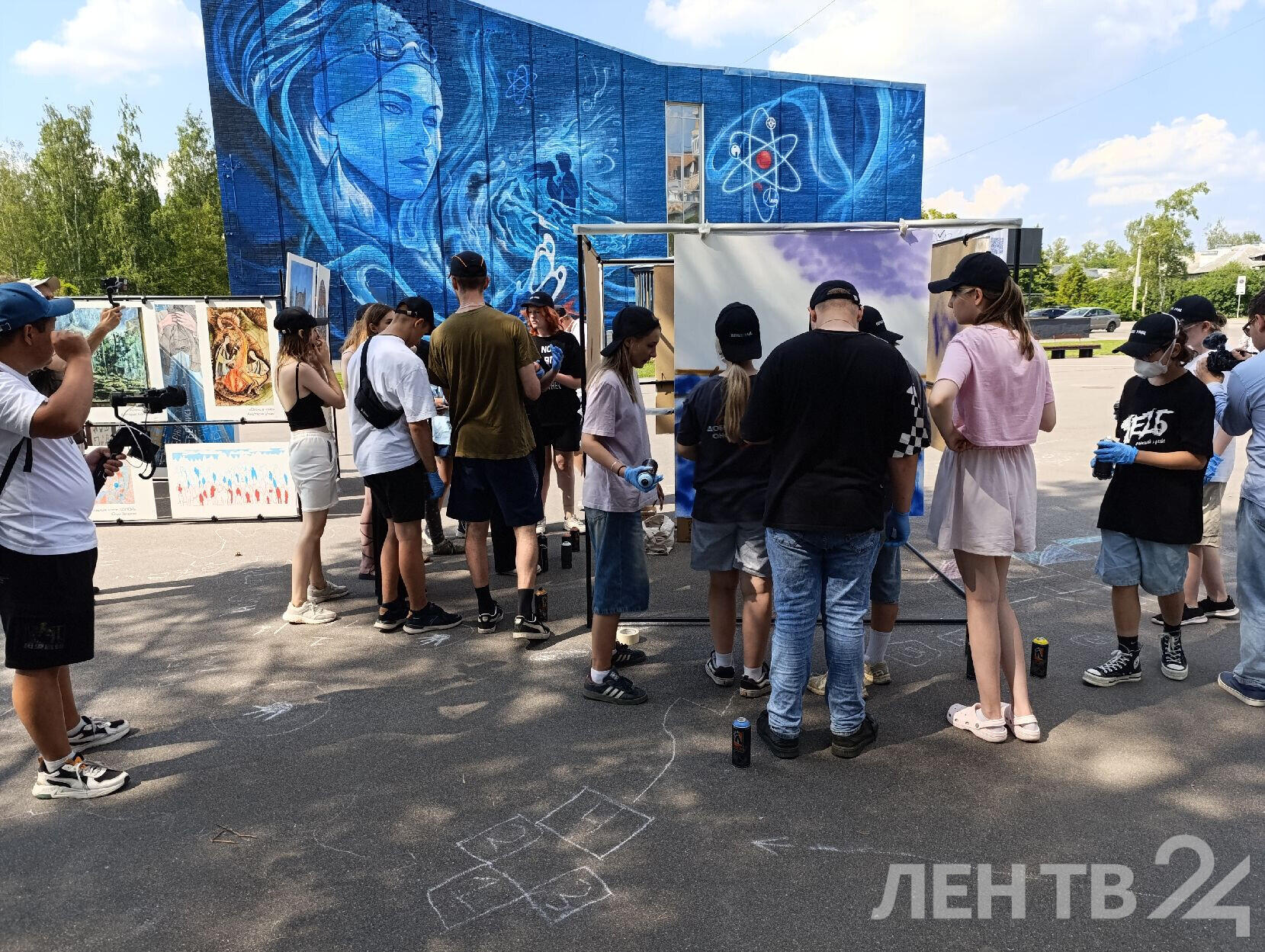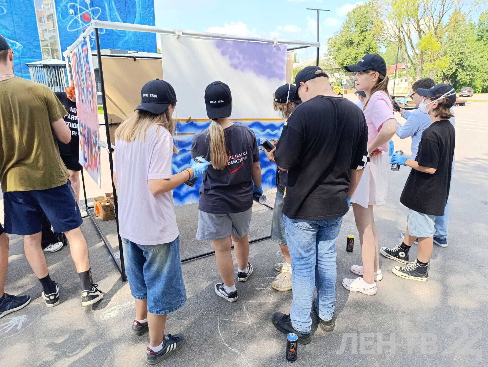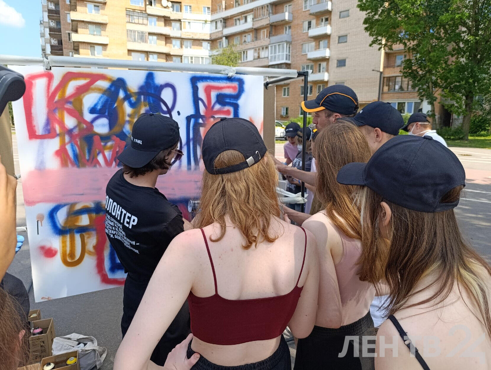 На здании бассейна центра развития физкультуры и спорта «Волна» открыли мурал, а затем провели мастер-класс по рисованию граффити. Его участниками стали десять человек – гатчинских добровольцев и восемь ребят из Курска, которые отдыхают этим летом в детских лагерях Ленобласти.
