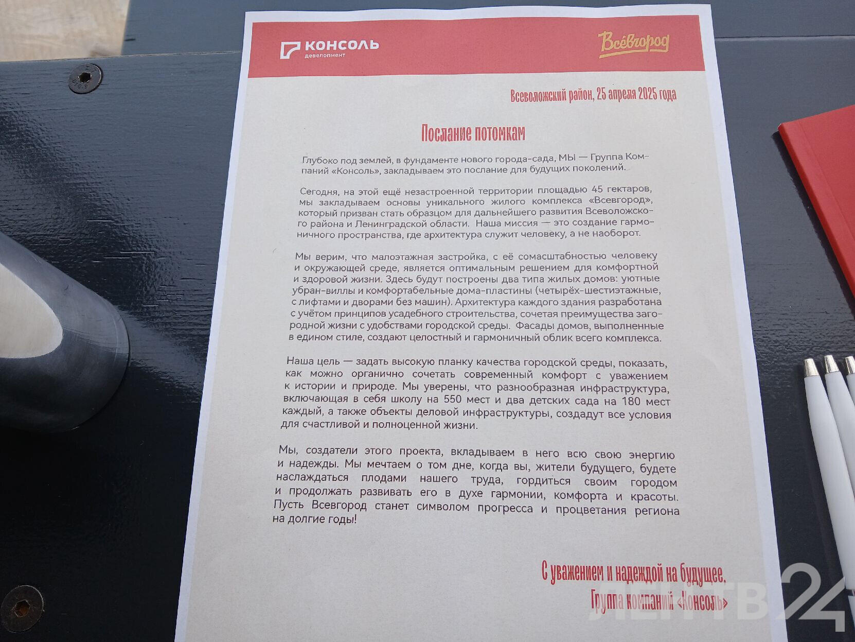 Заместитель министра строительства и жилищно-коммунального хозяйства Российской Федерации Никита Стасишин вместе с заместителем председателя правительства Ленинградской области по строительству и ЖКХ Евгением Барановским приняли участие в старте первого этапа жилого проекта «Всевгород», который реализует группа компаний «Консоль» в Романовском сельском поселении. Они заложили в фундамент одного из домов капсулу времени с посланием для потомков.