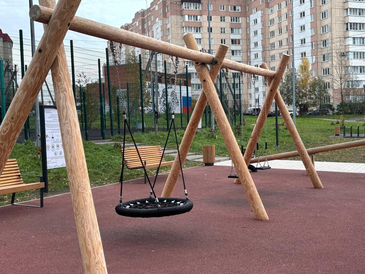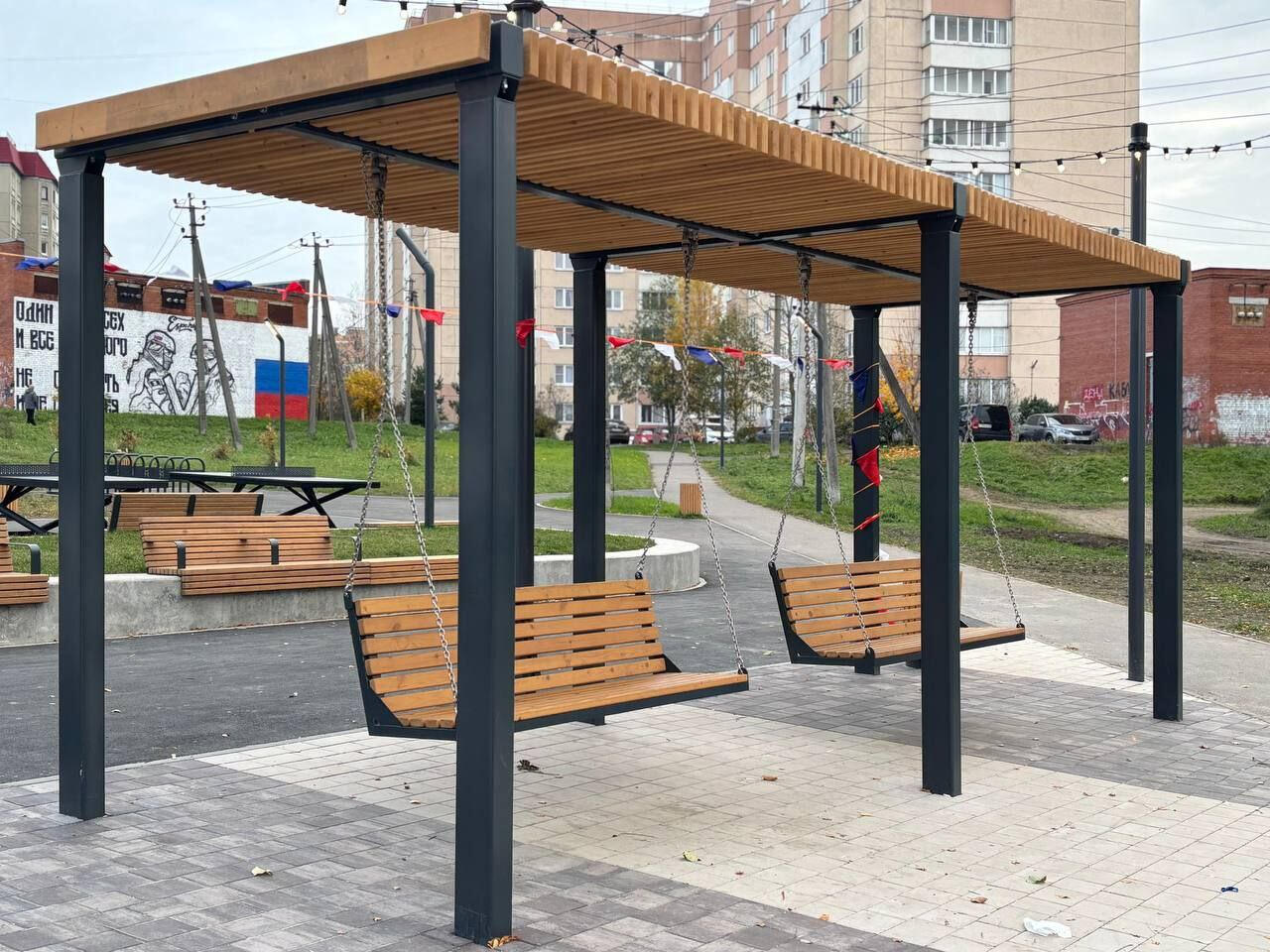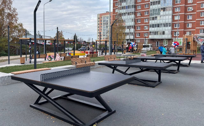 Здесь появились площадки для отдыха с навесами и качелями, место для игры в настольный теннис и яркая детская площадка. Кроме того, был уложен новый асфальт и резиновое покрытие.