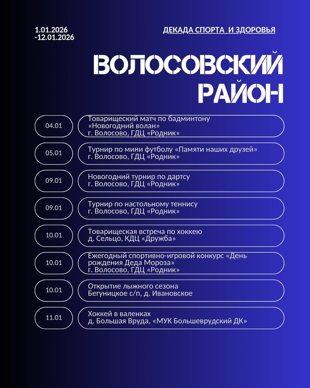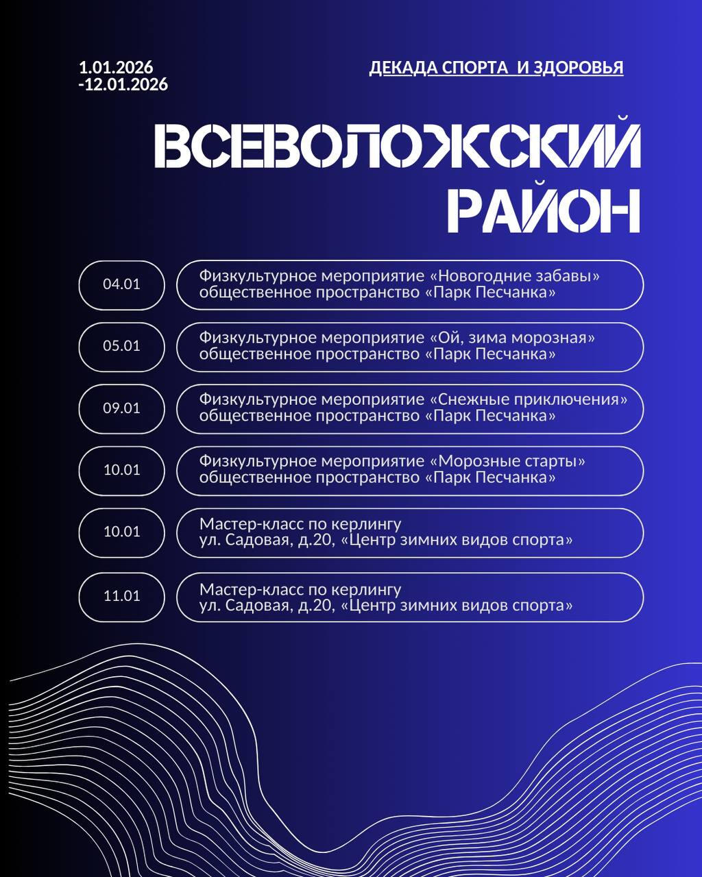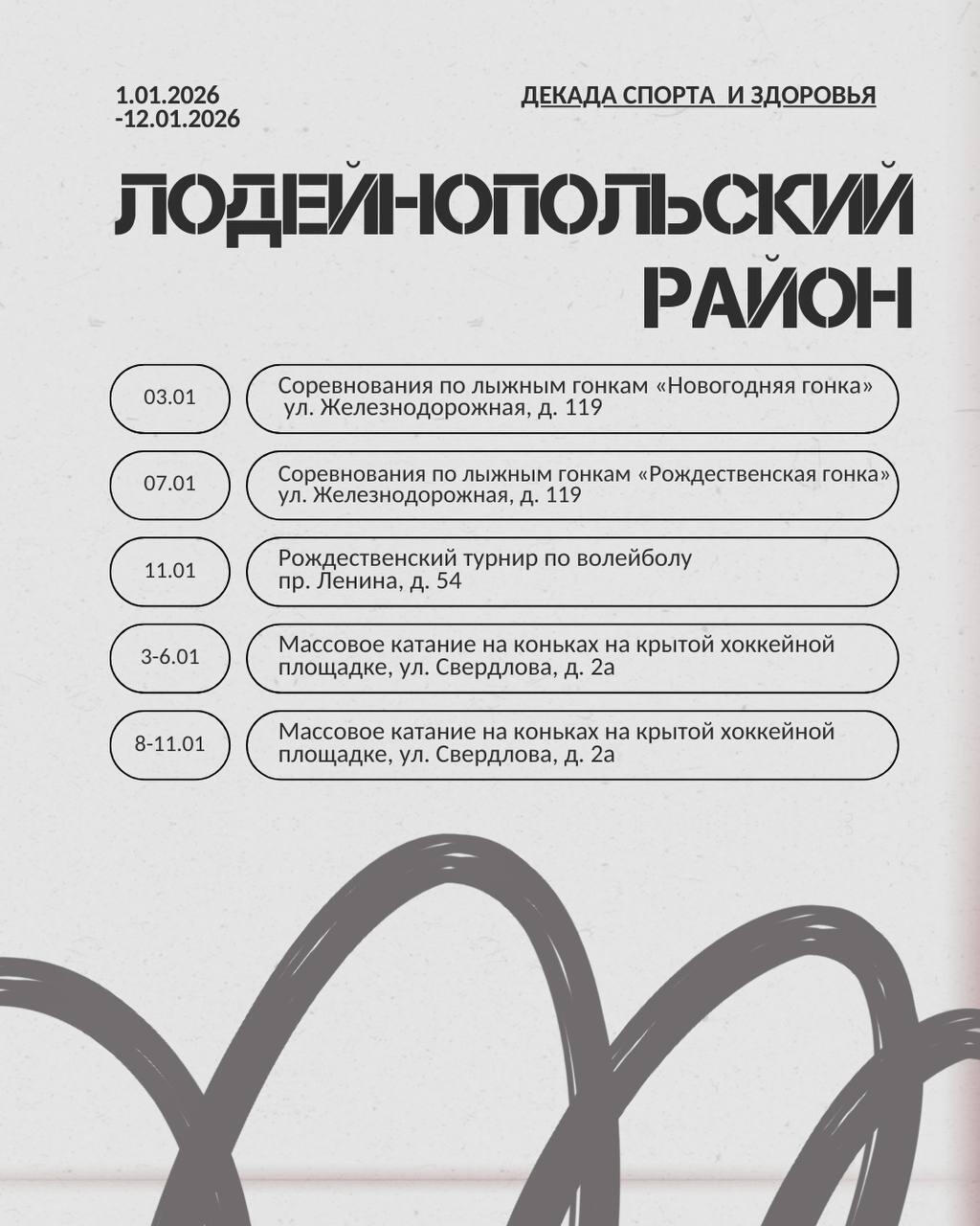 Жителей 47-го региона ждут эстафеты, новогодние забавы, мастер-классы, соревнования по различным видам спорта, в том числе хоккею, мини-футболу, настольному теннису, волейболу и другим.