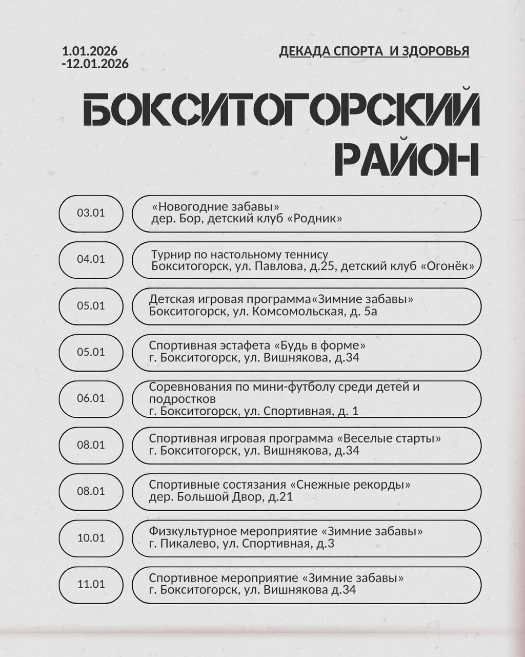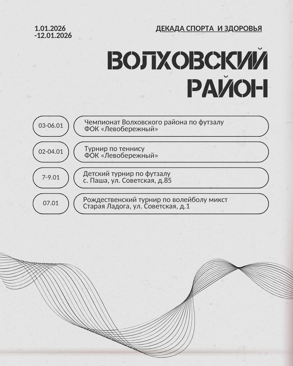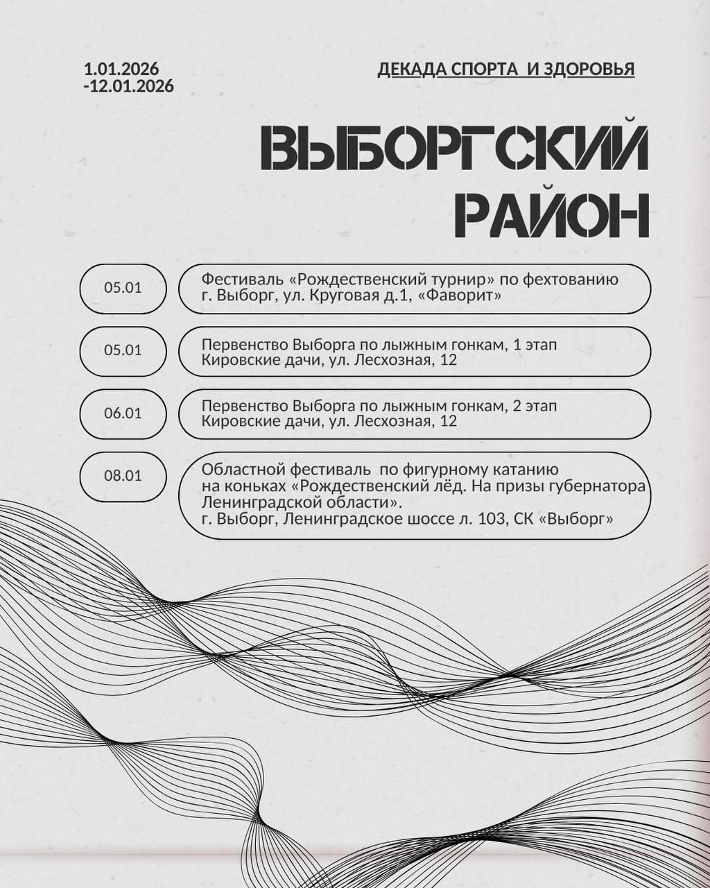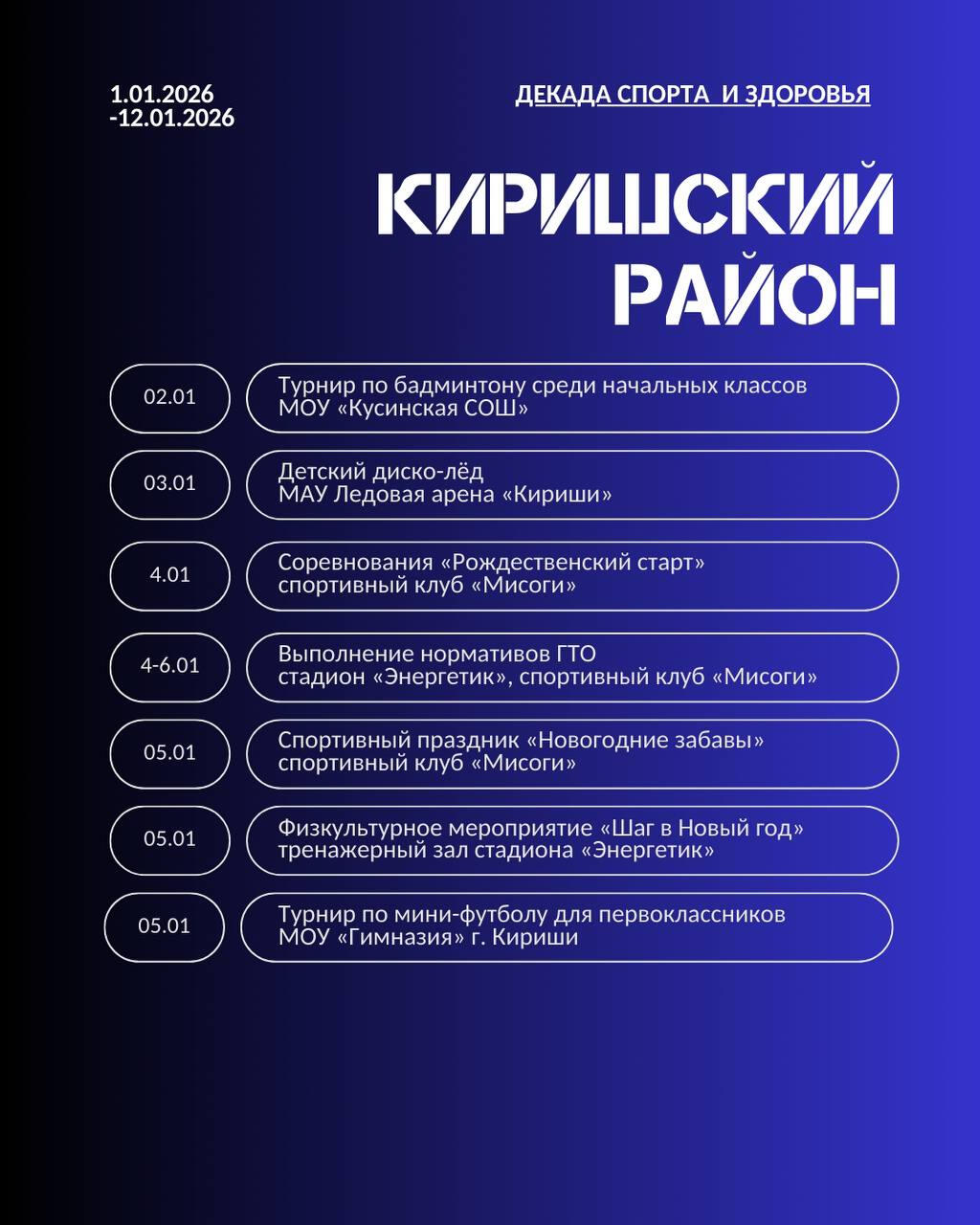 Жителей 47-го региона ждут эстафеты, новогодние забавы, мастер-классы, соревнования по различным видам спорта, в том числе хоккею, мини-футболу, настольному теннису, волейболу и другим.