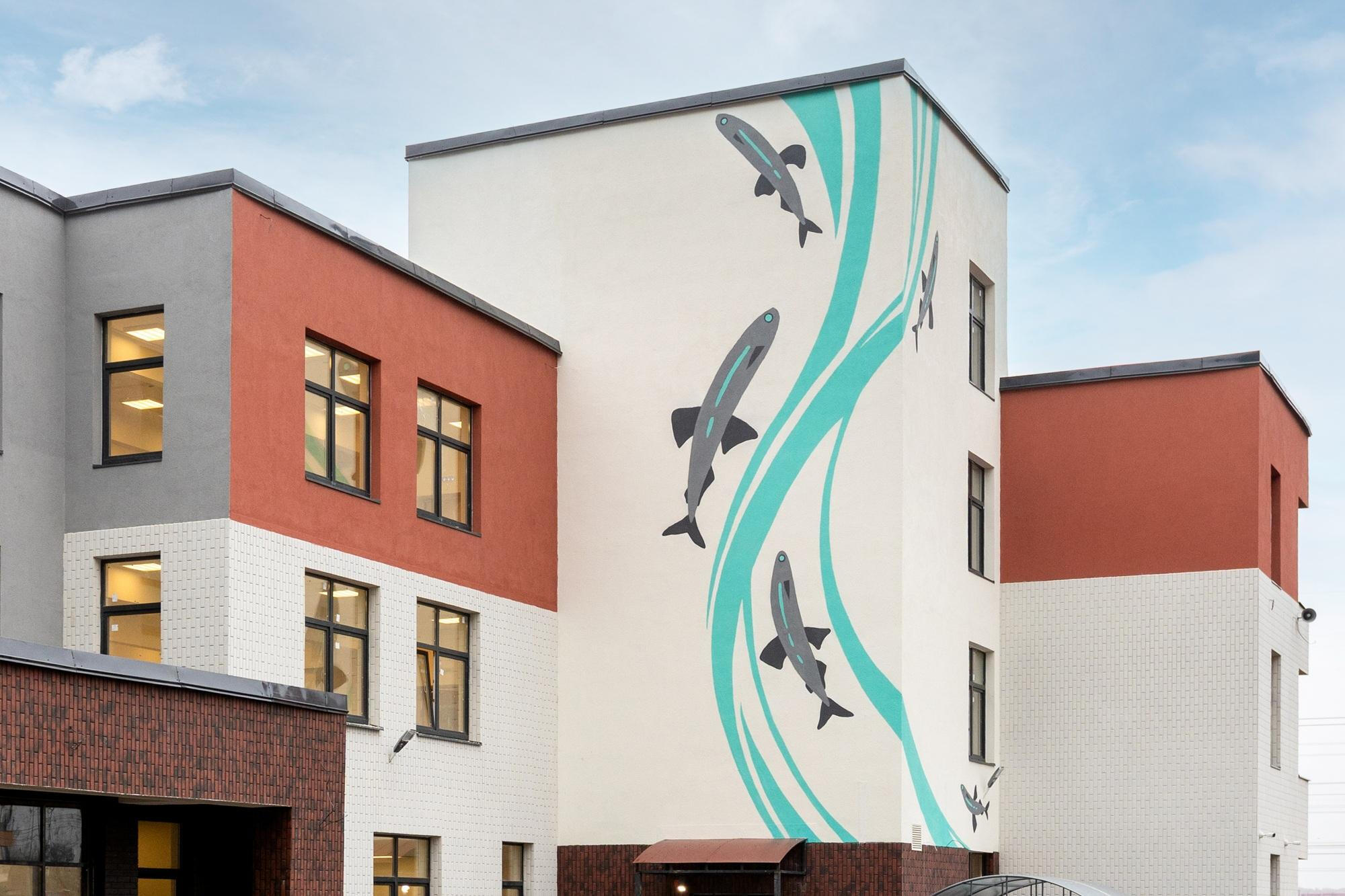 Для детей построили современное здание с яркими фасадами, украшенными изображениями символа Ленинградской области – корюшки. Внутри – групповые помещения, кабинеты для кружков, логопеда и психолога, медкабинет и столовая, а рядом с детским садом – игровые и спортивные площадки, а также теневые навесы с ящиками для игрушек. Не забыли и про велопарковки и навесы для колясок и санок.