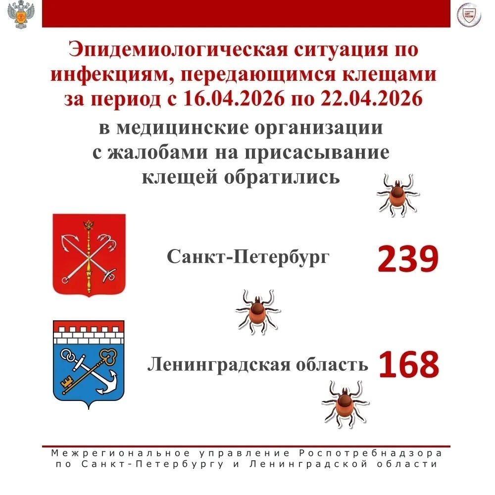 Опубликована статистика по укусам клещей в Ленинградской области. По данным Роспотребнадзора, с 16 по 24 апреля за медицинской помощью после укусов обратились 168 человек, в том числе 36 детей.