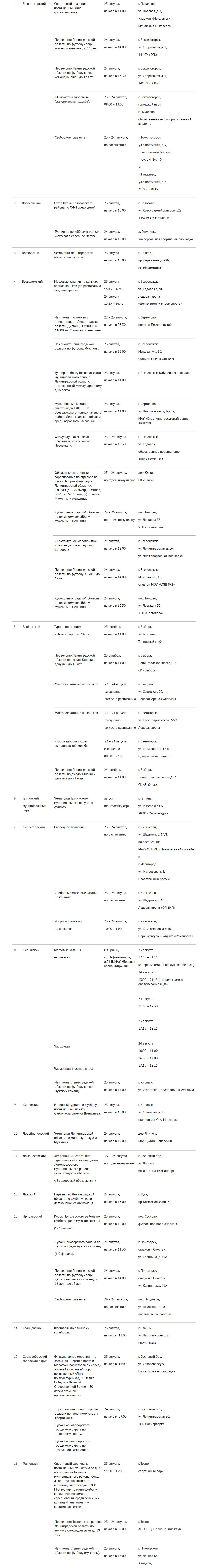 В Кировске пройдет футбольный турнир памяти Евгения Дмитриева, а в Сосновом Бору – баскетбольный марафон «Атомная Энергия Спорта». Тосно отпразднует 95-летие района большим фестивалем с единоборствами, шахматами и семейными соревнованиями.