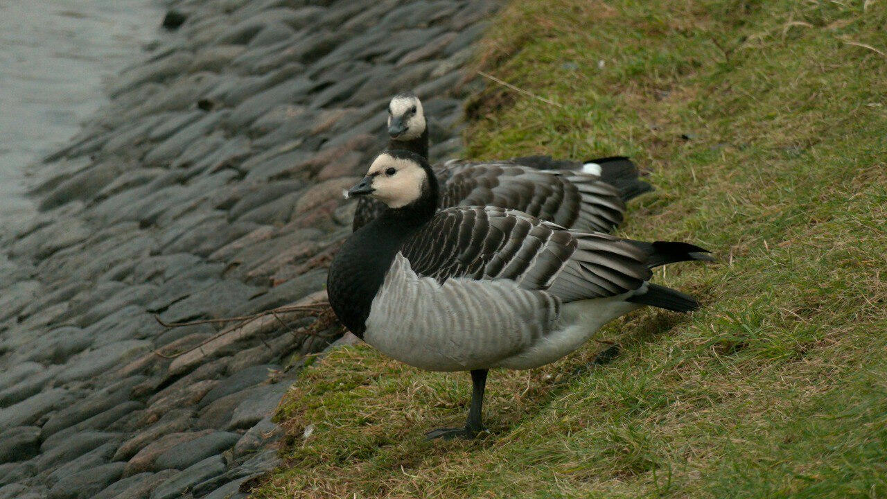 По всей видимости из-за теплой зимы эта пара не спешила на юг. Место для отдыха выбрано не случайно, ведь на заячьем острове много молодой зеленой травы, которая является основной едой белощекой казарки. Кроме того, вокруг достаточно воды. Она важна для безопасности, и чтобы периодически запивать сочную траву.