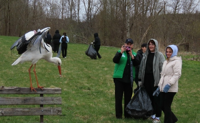 Но самый необычный участник субботника засветился в Сланцевском районе. Там к ленинградцам, работавшим на берегу реки Плюссы, присоединился аист. По словам очевидцев, он долго и внимательно наблюдал за людьми, а затем унес с очищенной площадки сухую веточку.