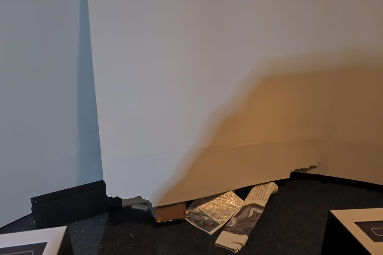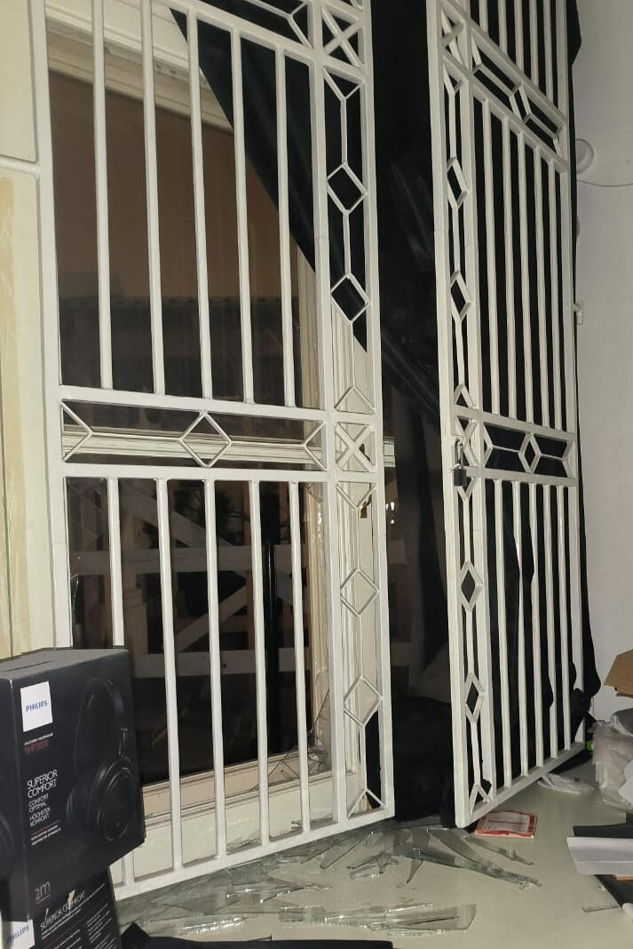Он разбил стекло и повредил решетку и экран настенного проектора.