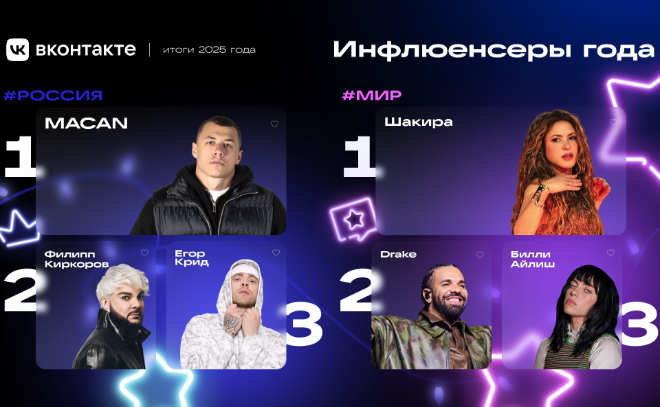 Самым обсуждаемым российским инфлюенсером стал MACAN. В соцсети говорили о его новом альбоме BRATLAND. Вторую строчку занял Филипп Киркоров с завирусившимся треком «Я эту жизнь тебе отдам». На третьем месте расположился Егор Крид: певец провёл тур по стране и выступил на VK Fest в Москве и Санкт-Петербурге.