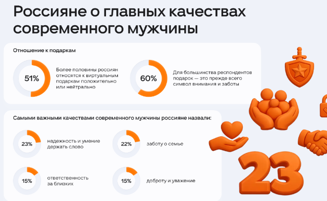 По данным опроса, для большинства респондентов подарок — это прежде всего символ внимания и заботы (60%). При этом мужчины чаще женщин отмечают, что подарок — это просто полезная вещь (17%). Самым запоминающимся подарком на 23 февраля большинство опрошенных называет любой неожиданный сюрприз (40%), причем среди мужчин эта доля выше и достигает 46%.