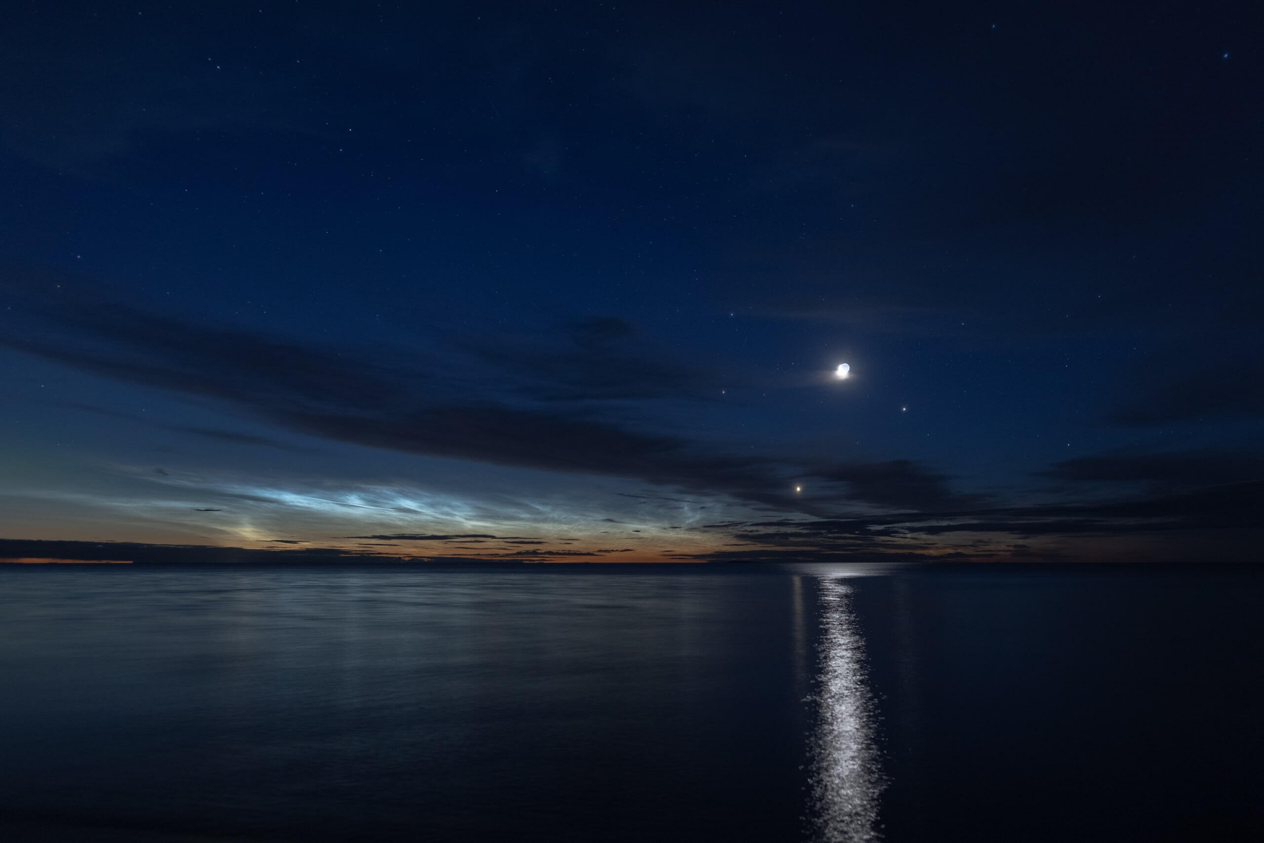 Хоть заранее и было понятно, что ждать сильных магнитных бурь не стоит, но была уверенность, что сияние ненадолго разгорится, как и прошлой ночью. Но сегодня добавился и тонкий серп Луны, и наши старые знакомцы - Венера и Юпитер, и серебристые облака.
