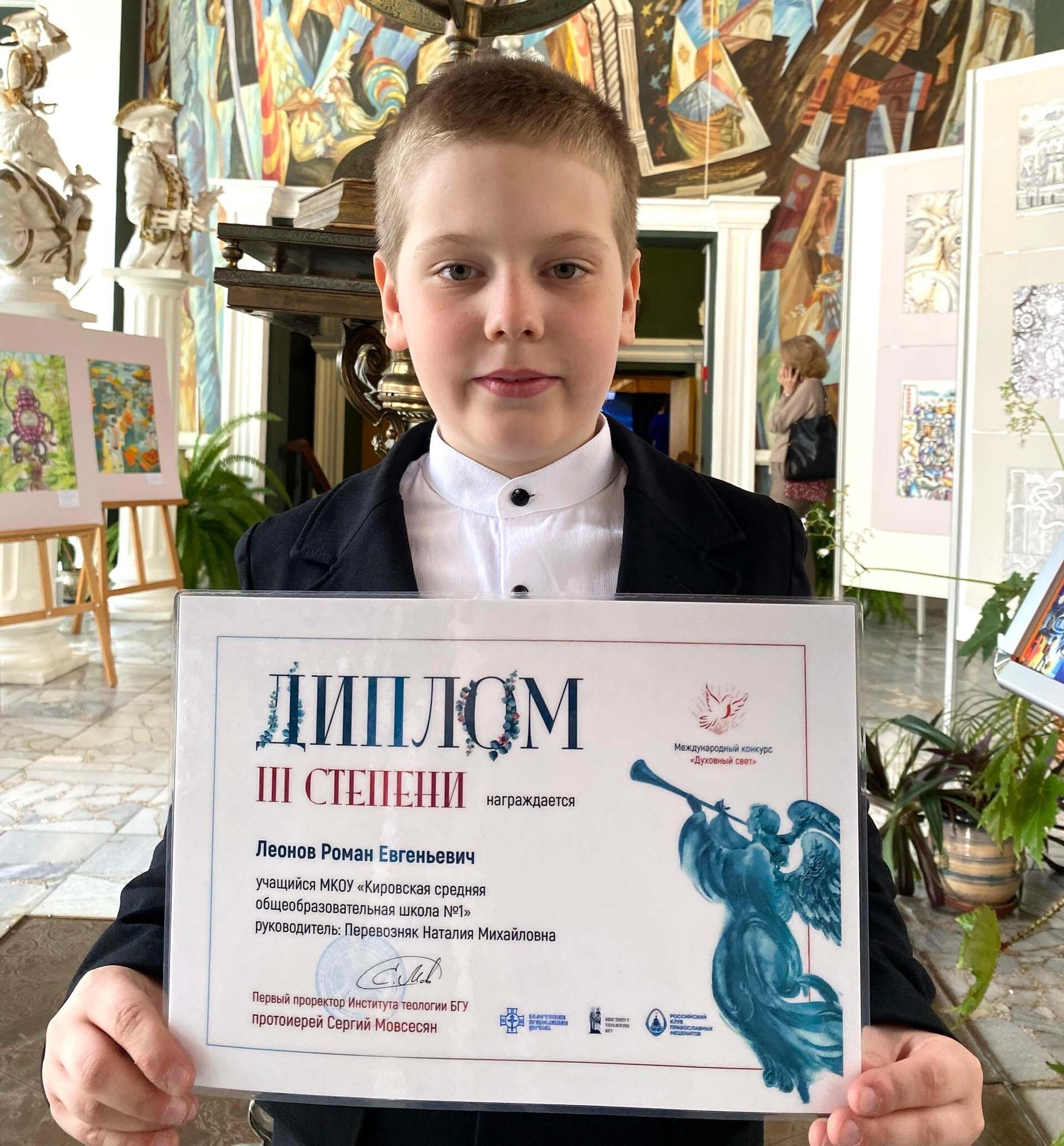 Ученик Кировской школы № 1 Роман Леонов одержал победу в номинации «Литературное творчество» в возрастной категории 9–10 лет. Его работа на тему «В поисках истины: мой путь к добру» получила высокую. Подготовила школьника к конкурсу педагог Наталья Перевозняк.